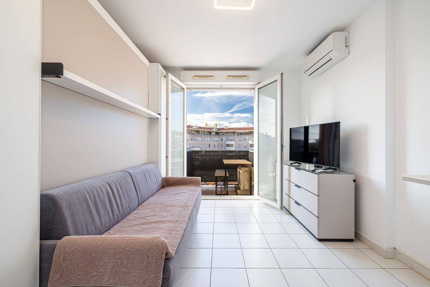 Au 5ème étage avec ascenseur, cet appartement de type studio entièrement meublé comprend un hall d'entrée avec un grand placard (idéal pour le rangement), une salle de douche avec Wc et meuble vasque, un séjour avec lit escamotable et rangements, un coin-cuisine ouvert équipé et un balcon.