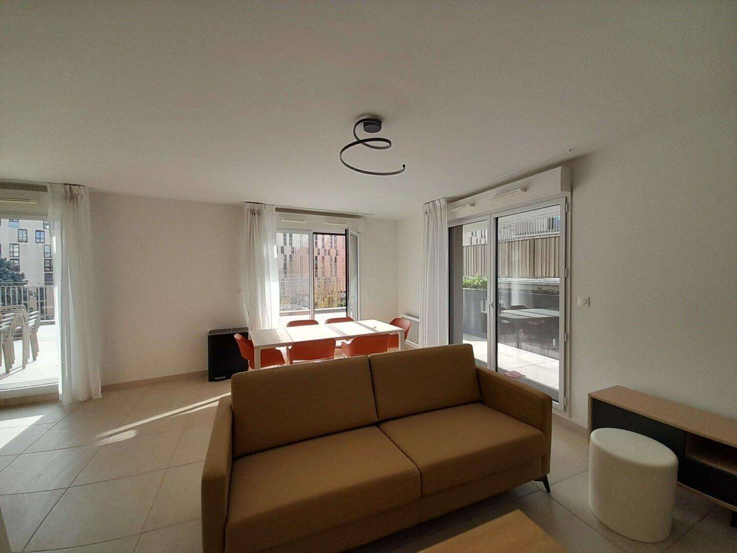 ..Dans une résidence imaginée comme un parc habité laissant la part belle à la végétation au coeur d'un quartier convivial et typiquement toulousain, à 200 mètres du métro (ligne A - arrêt Roseraie), Dans le quartier prisé de la Roseraie, T5 d'exception de 94m2 au 3ème étage d'une résidence neuve avec ascenseur. Le logement se compose d'un séjour spacieux avec cuisine ouverte entièrement équipée, de 4 chambres avec placard, une salle de bain lumineuse, une salle d'eau et wc séparé . Une terrasse périphérique de 115m2 est accessible de toutes les pièces. Ce logement atypique vous séduira par ses volumes et son emplacement. L'appartement est entièrement meublé, équipé et décoré. Vous disposez de 2 places de parking en sous-sol et d'un local à vélo commun. Pompe à chaleur et clim réversible. Libre de suite. Photos et plan non contractuels. Pas de frais d'agence et loyer à terme échu.