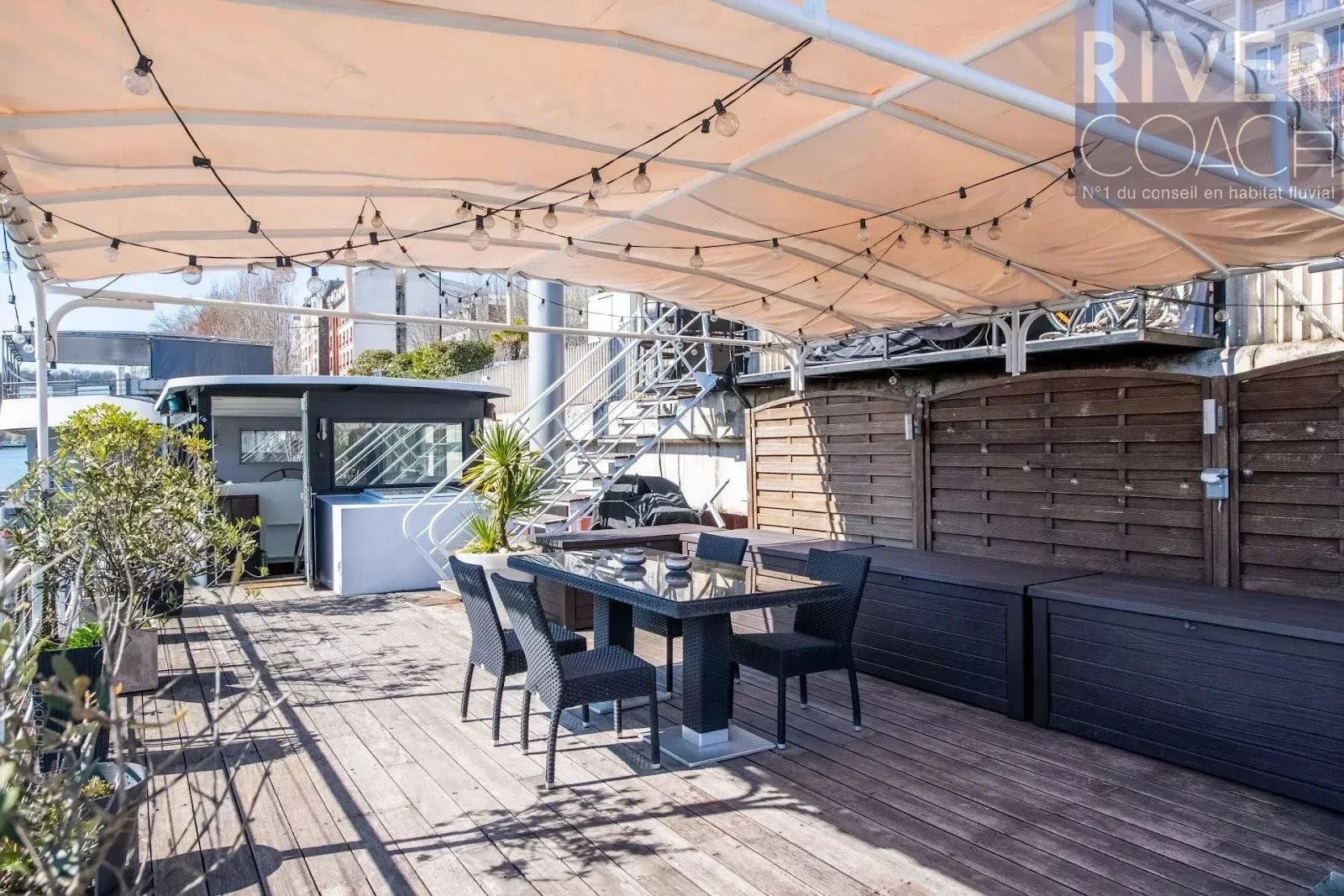 Rivercoach, n°1 du conseil en habitat fluvial et spécialiste de la vente de bateaux-logements, vous présente ce charmant bateau d’environ 180 m², avec une grande terrasse de 60 m² Bénéficiant d’une vue dégagée et d’une terrasse sans vis-à-vis, ce bateau offre un véritable havre de paix. De grandes ouvertures remplissent chaque pièces de vie de lumière, et met en valeur des volumes spacieux et bien pensés. La grande entrée accueillante donne accès à un salon/salle à manger convivial, prolongé par une cuisine moderne parfaitement équipée. La partie nuit comprend trois chambres confortables, avec la possibilité d’aménager une quatrième si besoins. Deux salles de bain et deux Wc apportent tout le confort nécessaire à la vie quotidienne. Points forts : Un cadre idyllique : Une terrasse de 60 m² et une vue dégagée, propices à la détente et à la sérénité. Des espaces généreux : Une configuration optimisée alliant volumes et fonctionnalité. Proximité idéale : À deux pas des transports principaux, des écoles et des commerces, pour un cadre de vie pratique et familial. Avec ses beaux volumes, sa luminosité exceptionnelle et sa grande terrasse, ce bateau incarne l’alliance parfaite entre confort moderne et charme fluvial.