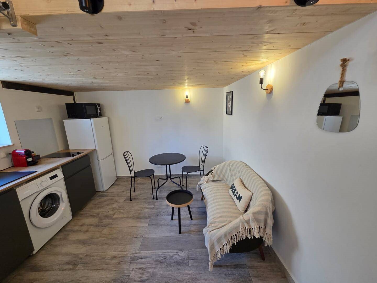 Beau studio climatisé entièrement meublé dans une rue calme proche du centre ville. Stationnements gratuits dans la rue et à côté de l'appartement. Chambre en mezzanine avec un lit de 140x190 cm pour 2 personnes. Cuisine et salle de bain entièrement équipées. Id...