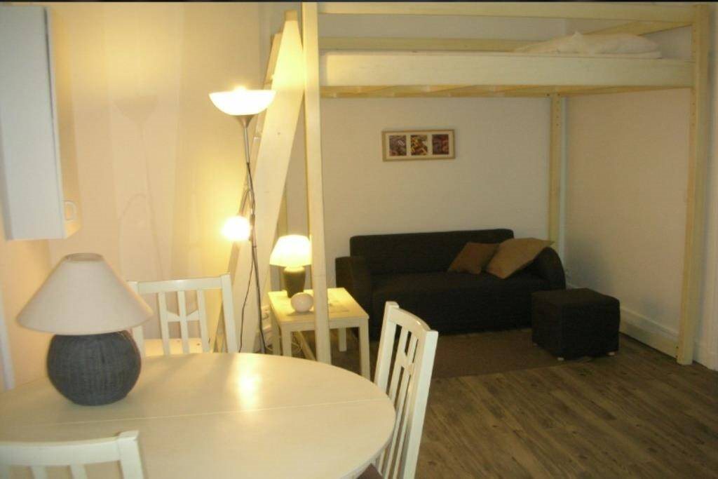 A louer, Paris Xvi, un studio meublé, comprenant une pièce principale, une cuisine, une salle de bains et un wc.