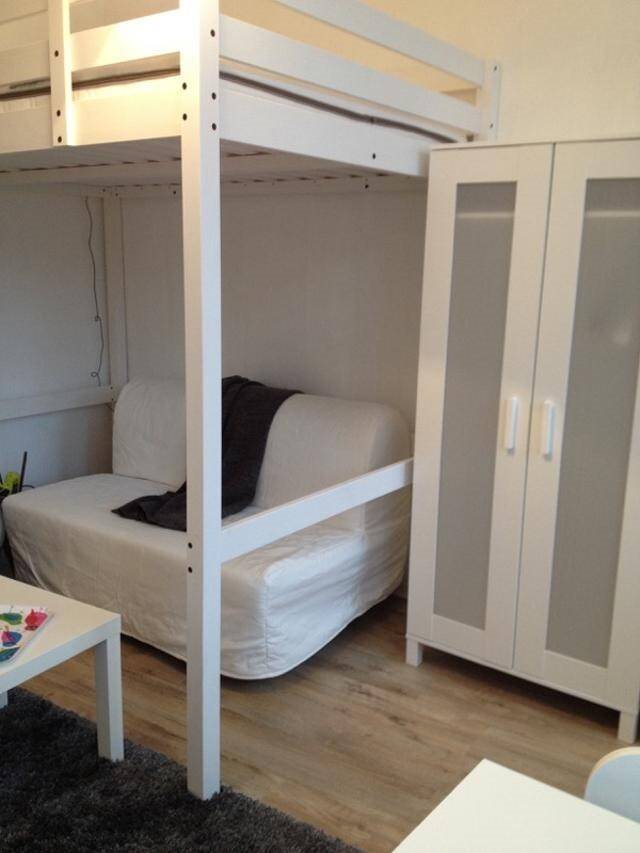 Studio meublé situé rue Lepelletier à proximité de la grand place et de la gare, pièce principale avec lit mezzanine, cuisine équipée séparée et salle de bain avec baignoire, vasque, wc et lave linge.