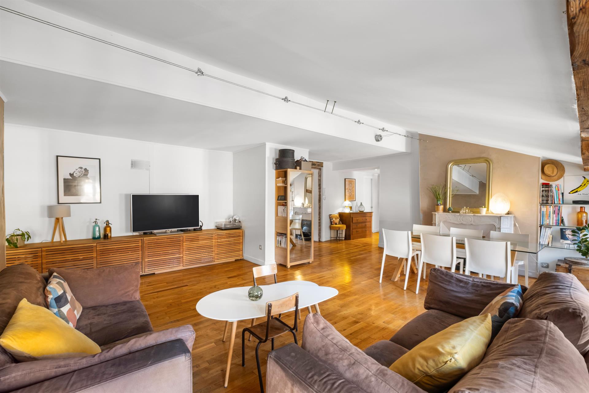 Dans un immeuble ancien au Métro Croix Paquet, 6ème et dernier étage, un appartement d’une surface de 68,25m2 carrez et 72,41m2 au sol. Il est composé d’une pièce de vie salon/salle à manger, une cuisine, deux chambres, une salle d’eau et d’un Wc indépendant. Exposition est-ouest Une luminosité exceptionnelle tout au long de la journée et un calme absolu. Il dispose également d’une cave et d’un grenier. Le chauffage est individuel,