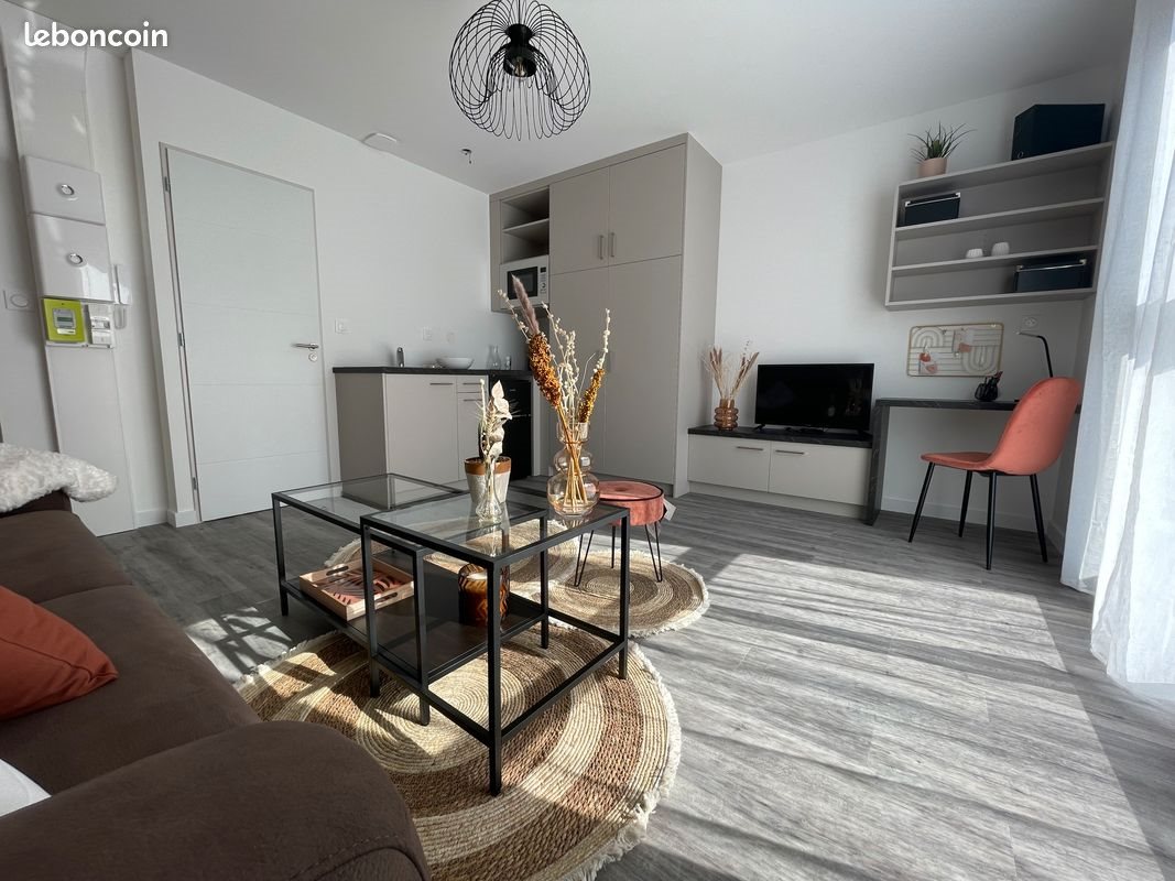Loue F1 dans une résidence neuve. Appartement entièrement meublé et équipé avec une pièce de vie comportant un canapé convertible, table basse, mobilier de rangement sur mesure avec coin bureau, Tv, coin cuisine équipé avec frigo, plaque de cuisson, machine à café, micro ondes, ustensiles de cuisine, rangement avec nécessaires de nettoyage, une salle de douche avec machine à laver, sèche serviettes électrique, chauffe eau instantané. Double vitrage Pvc avec volet roulant électrique, interphone et digicode pour un accès sécurisé. L'appartement est proche de commerces, transports, gare et centre ville. Loyer: 620€ dont 20€ de charges(eau et entretien des communs) Caution 2 mois de loyer. Visite sur rdv uniquement.
