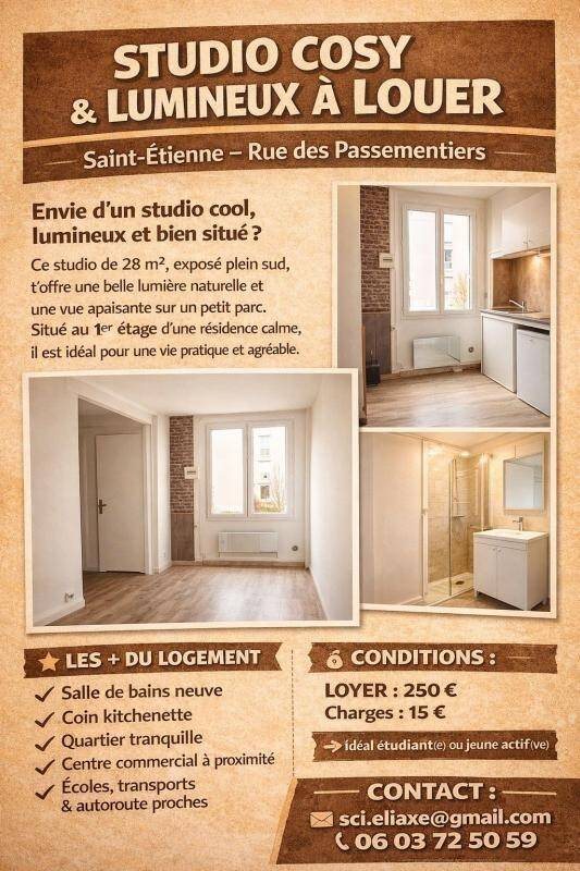Appartement de 28 m2 à louer sur Saint-Étienne Studio agréable refait à neuf de 28m2 exposé Sud en face d'un petit parc arboré. Nous sommes situés à 200 du centre commercial de Centre 2, proche de toutes les commodités écoles et accès autoroute. Nous serions heu...