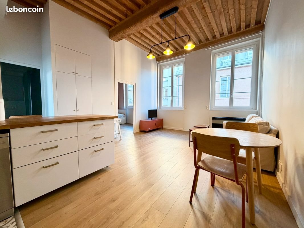 Appartement de 48m² à louer au 15 rue de l’Alma 69001 Lyon, au 3ème étage avec ascenseur, dans une petite copropriété très bien entretenue et au calme. Cet appartement présente des prestations haut de gamme (rénovation complète en 2016 et rafraîchissement complet en 2025), mobilier de grande qualité et neuf et première mise en location. Le chauffage est individuel gaz et la production d’eau chaude sanitaire est électrique. Le bien comprend deux chambres ainsi qu’une salle de bain Une cuisine équipée ouverte sur un grand salon. Il dispose d’un emplacement d’exception à 2 pas de la mairie de la Croix-Rousse, d’une grande hauteur sous plafond de 3m60 et d’une cave sécurisée et saine. L’Appartement est entièrement meublé. Le loyer mensuel est de 1150€. Les charges courantes de copropriétés (ordures, nettoyage, etc.) sont comprises dans le loyer. Le dépôt de garantie est de 2200€. Frais de dossier = 13€/m².