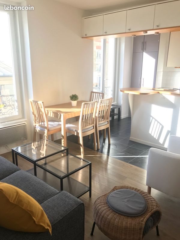[Location meublée - Grand studio/ 17e] Disponible début février Grand studio de 28 m² entièrement meublé et refait à neuf, très lumineux (pas de vis-à-vis et vue sur les toits), au 3ème étage sans ascenseur, sur rue calme (quartier plein de commerces) dans une copropriété résidentielle sécurisée. Il est constitué d'un salon, d'un espace nuit Loggia avec lit double escamotable, d'un espace salle à manger, d'une cuisine américaine équipée (réfrigérateur, congélateur, plaques vitrocéramiques à induction, four et rangements) et d’une salle de bain (baignoire, wc, sèche serviette, lave-linge). Nombreux rangements (grand dressing à l'entrée). Chauffage (électrique) et eau chaude individuels. Quartier agréable, à 5mn à pied des Batignolles, à 5 minutes de la ligne 13 (Brochant) et 8 minutes de la ligne 14. 1250€ par mois, charges de copropriété comprises.