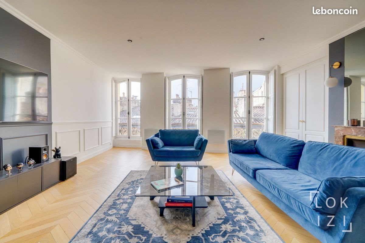 Bourse (Bordeaux hyper-centre), à quelques pas de tous Tram, au coeur du quartier historique (classé Unesco) à 2 min à pied des quais de Garonne et de place Saint Pierre : spacieux et lumineux appartement duplex T5 climatisé de 141m², entièrement meublé et équipé, avec cave, et offrant des prestations haut de gamme, situé au 4ème et dernier étage d'un immeuble en pierre (avec ascenseur), et comprenant : - entrée - grand séjour ( 50m²) sans vis-à-vis et exposé ouest avec cuisine ouverte (équipée de plaques de cuisson à induction, réfrigérateur-congélateur, lave-vaisselle, four, kit vaisselle et petit électroménager), espace repas, et espace salon (avec Tv murale) - wc - chambre de type suite parentale avec salle de douche A l'étage : - 3 grandes chambres mansardées et climatisées avec double couchage, - wc - 1 salle de bains (avec baignoire et lave-linge) et 1 salle d'eau (douche) Charme de l'ancien rénové avec parquet en chêne et pointe de Hongrie, moulures et cheminée, Bon à savoir : surface au sol Carrez 110m² / mobilier de rangement pas visible sur photo mais présent + immeuble fibré + cave de 20m² + climatisation. Sur place ou à proximité immédiate : tous transports tram A / B / C /D et bus (avec accès direct gare St Jean et aéroport), nombreux restaurants sur place (St Pierre / Parlement), Grand Théâtre, quais de Garonne, quartier piéton Saint Catherine. [Zone Soumise A Encadrement De Loyer : complément de loyer pour emplacement, prestations de qualité haut de gamme, cave, climatisation.
