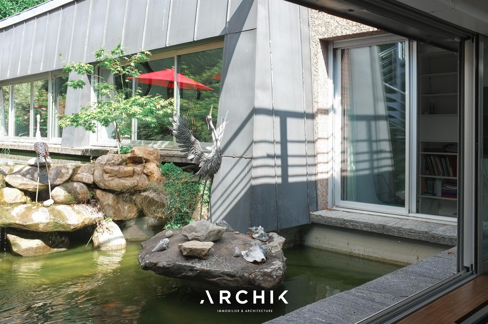 La maison est construite en L autour d'un jardin à la mise en scène aquatique, paré d'éléments d'inspiration japonaise permettant aux occupants une relation étroite avec une nature miniaturisée : bassin, rochers, cascade, arbustes, mur de galets blancs et sculptures.Ce refuge vivant se tient sur trois demi-niveaux et dévoile des espaces, des vues, des patios et des volumes au caractère exceptionnel. Les années 70 ont donné lieu à toutes sortes d'audaces créatives : alignement intérieur et extérieur de murs en brique ou béton bouchardé, décrochés, patios aux fenêtres sur bassin et jardin. Chaque escalier, chaque plafond de voutes en bois sombre aux lignes organiques a été pensé par l'oeil attentif de l'architecte.Après quelques marches, le premier demi-niveau donne accès à un espace salon et une terrasse privative coté Est baigné de la lumière du matin, puis un espace nuit avec deux chambres comprenant chacune leur salle d'eau. A l'étage, le L de l'architecture autour du bassin japonais se retrouve. Les baies vitrées se transforment en tableaux vivants sur la nature intimiste. Le volume de la pièce à vivre avec sa hauteur sous plafond de plus de 4 m et sa surface de 80 m2 donne une sensation de volume, de respiration et des vues baignées de lumière sur son univers aquatique et exotique. La cuisine en corian blanc s'y intègre parfaitement en respectant l'esprit zen du lieu. L'ensemble des pièces est paré de pierre de Cascais sable pour une unité parfaite des espaces. Les diagonales visuelles, inlassablement éclairées par la lumière de l'Est ou de l'Ouest apportent beaucoup de chaleur à cette architecture brutaliste revisitée. Les fenêtres aux formes géométriques donnent sur le patio végétal avec son bassin japonais et font rentrer lumière et nature dans l'habitat, typique de ces années et de l'architecture de Wright. Le L du plan se poursuit par une suite parentale avec sa salle de bain en marbre d'Italie toujours sur la nature tel un temple d'intimité où l'âme peut s'étendre, rêver et écouter l'eau du bassin fontaine.