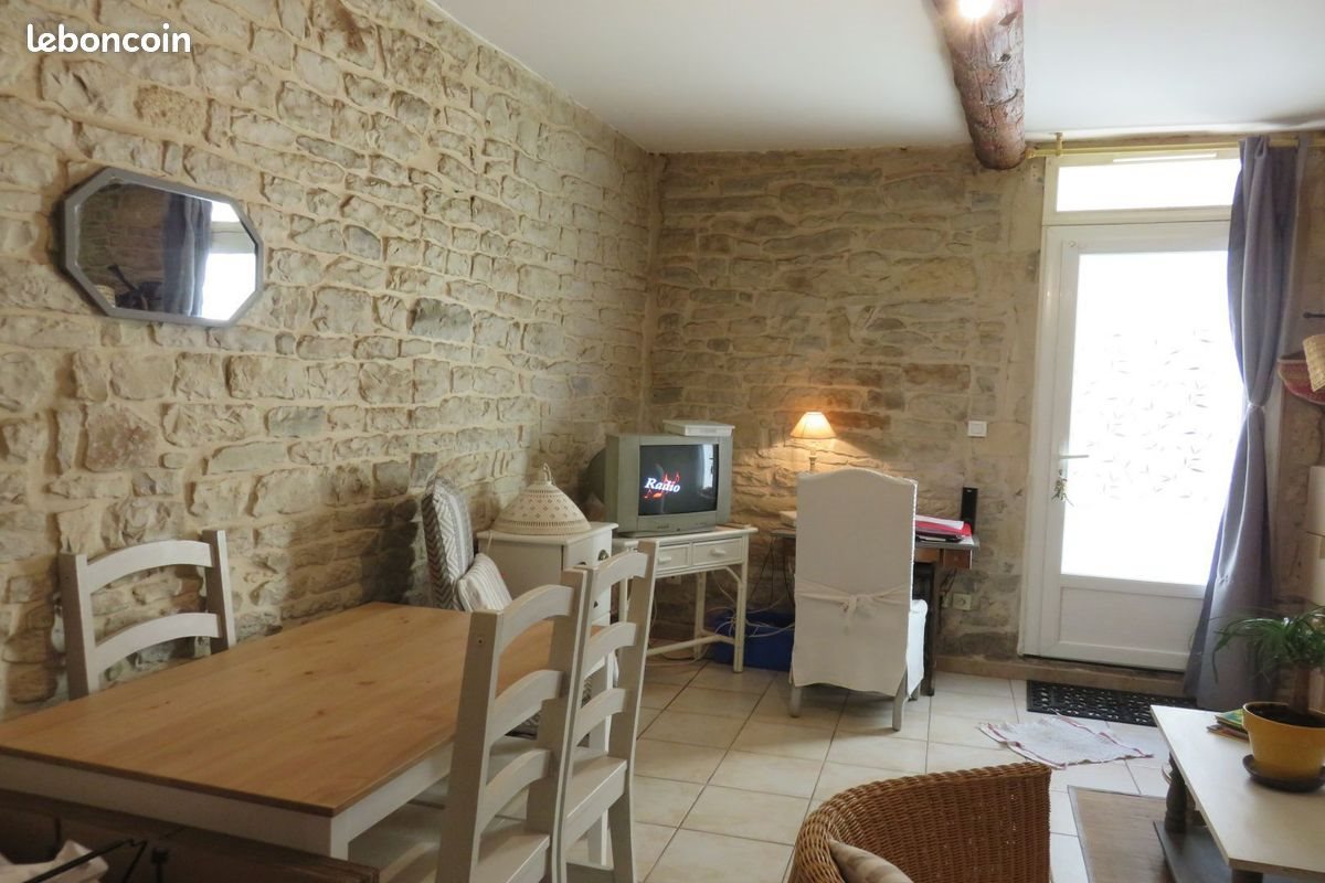 Calvisson, coeur de village. Rez de chaussé d une maison de village, P2 avec pierres et poutres apparentes. Composé d'une pièce principale avec coin cuisine, d'une salle de bain, d'un Wc et d'une chambre avec accès à la cour. Idéal pour personne seule ou jeune couple.