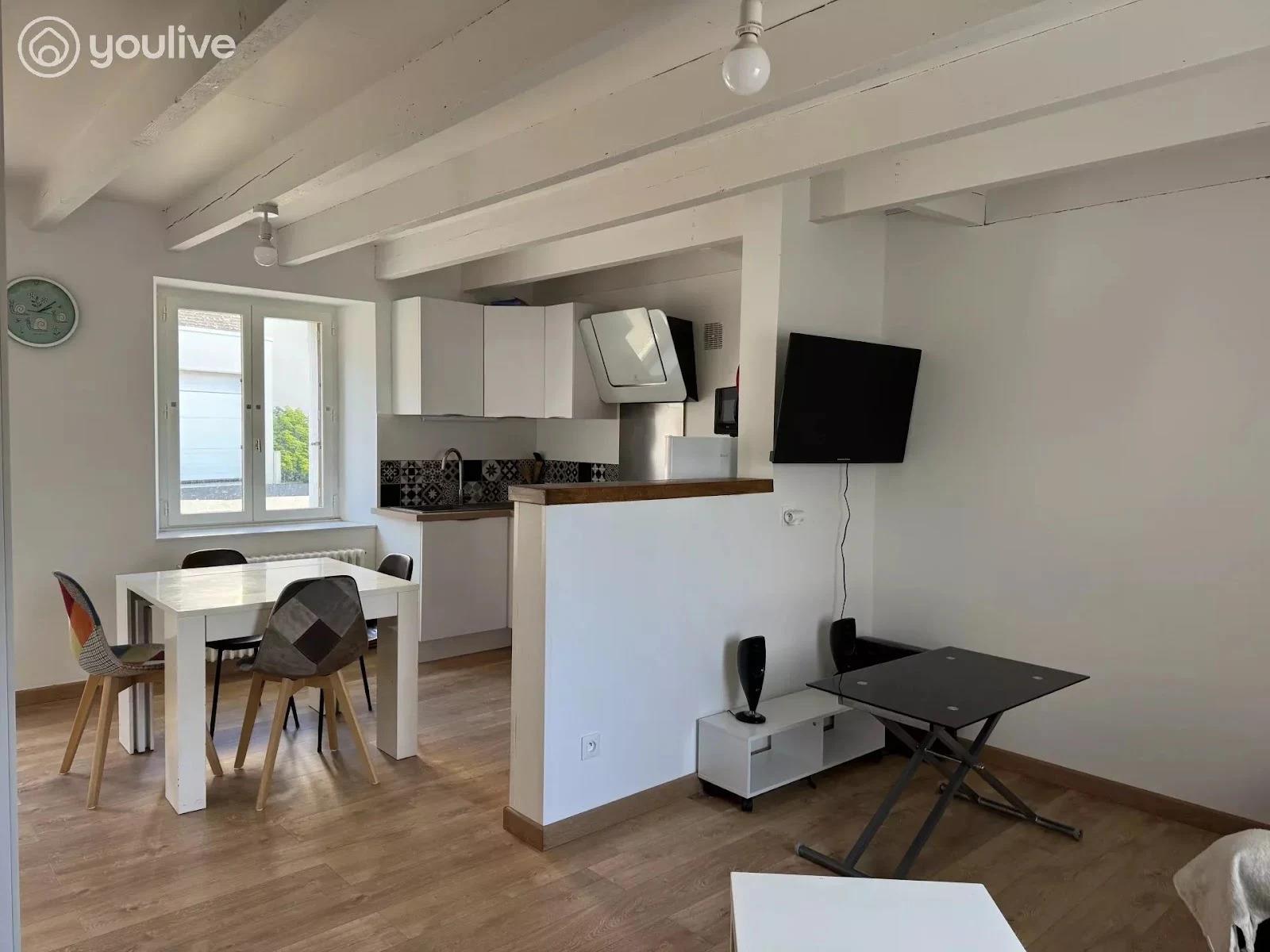 Duplex meublé – (62m2) Centre-ville de Loudéac Charmant appartement en duplex comprenant une belle pièce de vie avec cuisine équipée ouverte, deux chambres à l’étage et une salle d’eau avec Wc.