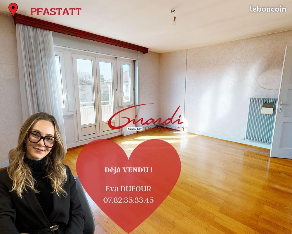 Appartement 4 pièces 81 m² Pfastatt, Parc Denise Ferrier, Appartement De 80,82M2 Avec Cave, Possibilite D'acquerir Un Garage En Sus ! Uniquement Chez Girardi Immobilier ! Visite Virtuelle Disponible Sur Notre Site Internet Girardi-immobilier-Pfastatt com Dans un cadre arboré, appartement de 80,82m2 Au 3 eme et dernier étage sans ascenseur, entrée avec cellier, salon séjour de 19m2 avec un balcon exposé est-Ouest, une première chambre de 9,58 m2, une grande cuisine indépendante équipée avec son cellier attenant, salle de bains avec baignoire et meuble vasque , wc séparé, 2 chambres de 15.45m2 et 9.76m2...une grande cave et possibilité d'acquérir un garage en sus ...Le Tout Totalement À Rafraîchir .. Les Plus : - Faibles charges de copropriété 96Eur par mois ( eau froide, syndic, entretien des espaces verts, assurance du bâtiment compris) -Chaudière individuelle gaz de 2019, fenêtres double vitrage Pvc, parquet massif dans le salon et les chambres -cave et possibilité d'acquérir un garage en sus -Copropriété au Calme située au parc Denise Ferrier, possibilité de profiter d'espaces verts en copropriété -Stationnement libre sans difficulté devant la copropriété -prévoir travaux de rafraîchissement : tapisseries, peintures, certains sols, cuisine et salle de bains datée mais en état d'usage Pour Visiter Eva [Coordonnées masquées] Surface : 81 m² A propos de la copropriété : Pas de procédure en cours Nombre de lots : 376 Consommation énergie primaire : 0308 kWh/m²/an Consommation énergie finale : 0 kWh/m²/an