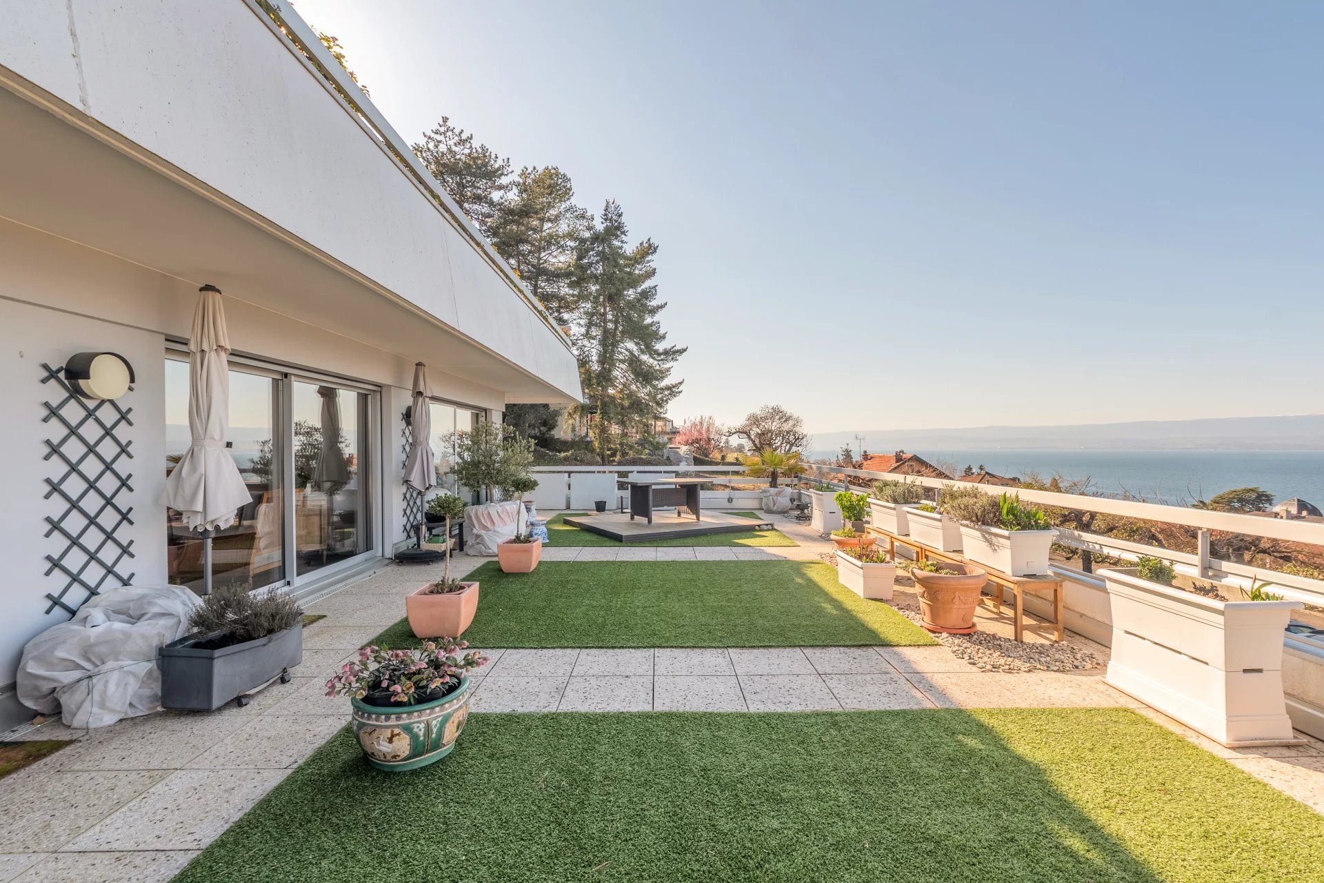 Exclusivité - Situé au sein d'une copropriété de haut standing au parc soigneusement arboré, cet exceptionnel appartement d'angle séduit par sa vue panoramique sur le lac Léman et son cadre de vie privilégié. Conçu avec des matériaux de qualité, il se distingue également par ses beaux volumes et son agencement bien pensé. Sa vaste pièce de vie baignée de lumière, grâce à de larges baies vitrées, crée une continuité naturelle entre intérieur et extérieur en se prolongeant harmonieusement par une terrasse de 106 m². La partie nuit propose deux chambres en suite, toutes deux ouvertes sur la terrasse, créant une dimension supplémentaire. Une cave ainsi qu'une place stationnement intérieur viennent parfaire ce bien.
