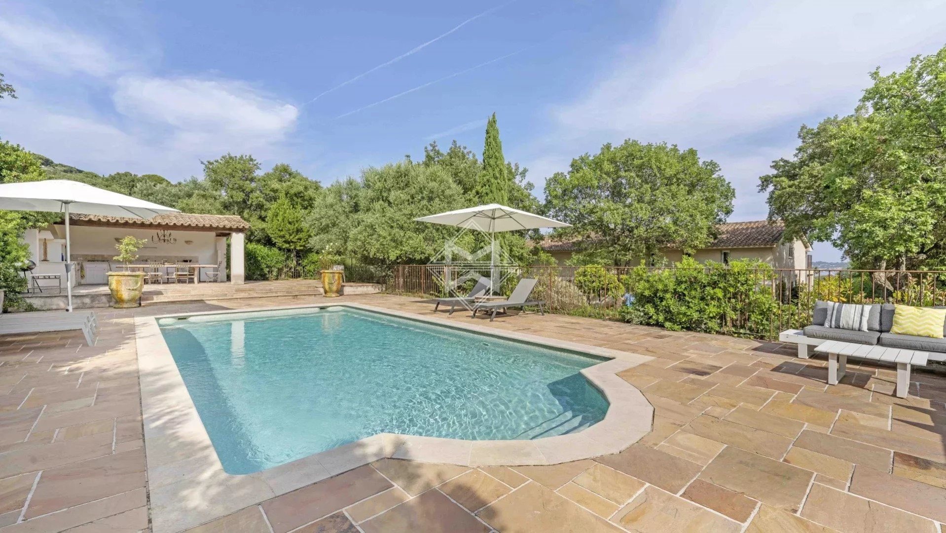 Idéalement située dans le Domaine de Beauvallon Bartole, cette villa de 6 chambres doubles, avec salles de bain privées, est implantée sur un terrain paysagé de 4400m2. Répartie sur deux étages, la maison est équipée de deux cuisines tout équipées, d'une grande salle à manger entourée de baies vitrées et de deux jolis salons. La propriété est élégamment décorée dans un style qui allie le charme provençal au confort moderne, grâce au système de climatisation dans toutes les chambres. Avec une exposition Est, la villa reste baignée de lumière toute la journée grâce à de grandes baies vitrées. A l'extérieur, une grande piscine de 12 mètres de long vient agrémenter le jardin, avec une douche extérieure et un pool house tout équipé pouvant accueillir jusqu'à 12 convives. Une jolie fontaine rappelle l'esthétique art-déco, tandis que des bougainvilliers parcourent la façade au niveau de l'entrée principale. Les accès au cours de golf, de tennis et au ponton privé sont facilités grâce au système d'adhésion du domaine. Toutes les conditions sont réunies pour un séjour idéal, dans un cadre enchanteur et propice à la détente, avec une vue panoramique sur le Golfe de Saint-Tropez.