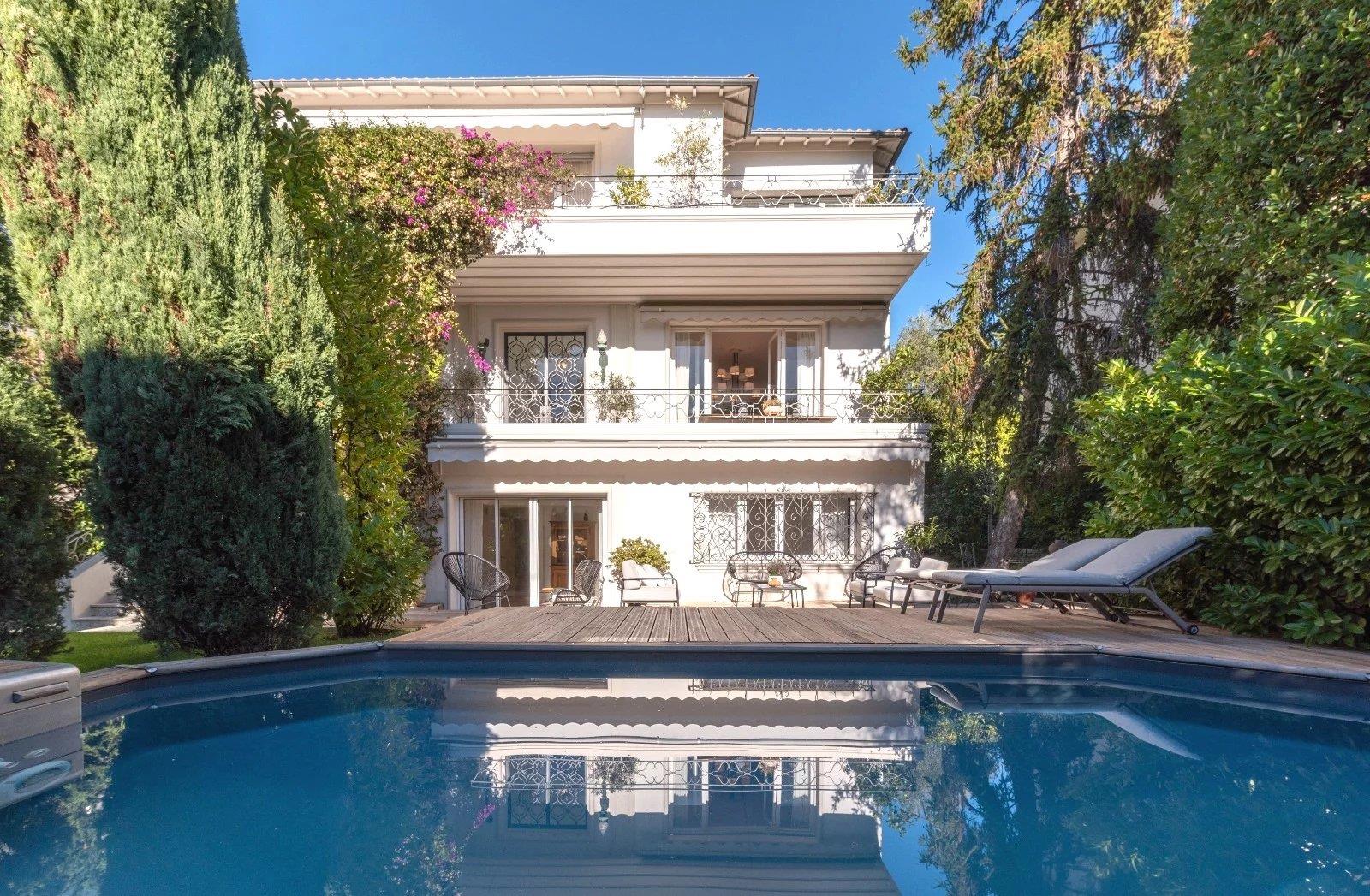 Élégance intemporelle et rareté au cœur de Cimiez Idéalement située dans le quartier résidentiel le plus prisé de Nice, au cœur de Cimiez, cette villa Art Déco d’exception incarne à la perfection l’élégance, l’histoire et l’authenticité du patrimoine niçois. Édifiée sur un terrain paysager de 800 m², cette propriété rare bénéficie d’un emplacement privilégié, à la fois calme, ensoleillé et proche du centre-ville — un secteur exceptionnellement recherché où les opportunités se font rares. Véritable œuvre d’architecture, la villa déploie près de 360 m² sur trois niveaux, composés de 11 pièces, dont 7 chambres. Ses volumes généreux, ses terrasses à chaque étage et son style Art Déco préservé lui confèrent un charme intemporel et une atmosphère unique. Dès l’entrée, la villa séduit par l’harmonie parfaite entre architecture d’époque et confort contemporain. Le premier niveau s’articule autour d’un séjour spectaculaire de plus de 50 m², baigné de lumière grâce à de larges baies vitrées offrant une triple exposition. Ce vaste espace de réception, à la fois élégant et convivial, s’ouvre sur de grandes terrasses et se prolonge par une salle à manger raffinée, idéale pour recevoir. Une cuisine indépendante, spacieuse et parfaitement équipée, ainsi qu’un toilette d’invités complètent cet étage, où chaque détail a été pensé pour conjuguer lumière, volume et art de vivre. À l’étage, l’espace nuit offre une atmosphère apaisante et élégante. Il comprend une somptueuse chambre de maître avec son dressing sur mesure, ainsi que trois grandes chambres supplémentaires, une salle de bains, deux salles d’eau et un toilette séparé. Les espaces, généreux et harmonieux, allient confort, raffinement et intimité. En rez-de-jardin, un appartement indépendant aux lignes contemporaines accueille famille et amis dans un cadre chaleureux. Il se compose de trois belles chambres, d’un séjour avec cuisine ouverte, de deux salles d’eau et de deux toilettes, offrant un espace de vie autonome et accueillant. Implantée dans un écrin de verdure soigneusement paysagé, la propriété bénéficie d’une intimité rare et d’un environnement résidentiel privilégié, à proximité des musées, écoles réputées et commodités de Cimiez. Une piscine élégante, de nombreuses terrasses ensoleillées et un garage fermé pour deux véhicules viennent parfaire cet ensemble d’exception. Alliance parfaite entre architecture d’époque, volumes contemporains et situation rare, cette villa Art Déco représente une opportunité unique sur le marché niçois. Une adresse exclusive, destinée aux amateurs de belles demeures et aux passionnés d’histoire et d’art de vivre.