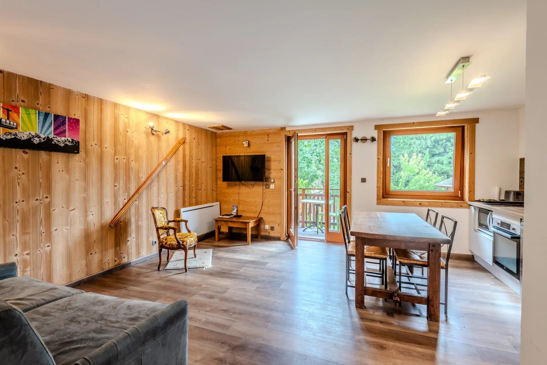1-Bedroom Apartment, 41.64 m² in Renovated Farmhouse – Chamonix Les Praz Located in the highly sought-after area of Les Praz in Chamonix, this charming one-bedroom apartment of 41.64 m² is set within an authentically renovated farmhouse, combining traditional charm with modern comfort. The apartment comprises: an entrance hall with storage, a fully equipped kitchen open to the living area with a south-facing balcony, one bedroom, a shower room, and a separate toilet. Unobstructed views of the Chamonix Aiguilles and Mont Blanc. Small condominium of 4 units with very low charges, mainly limited to building insurance.