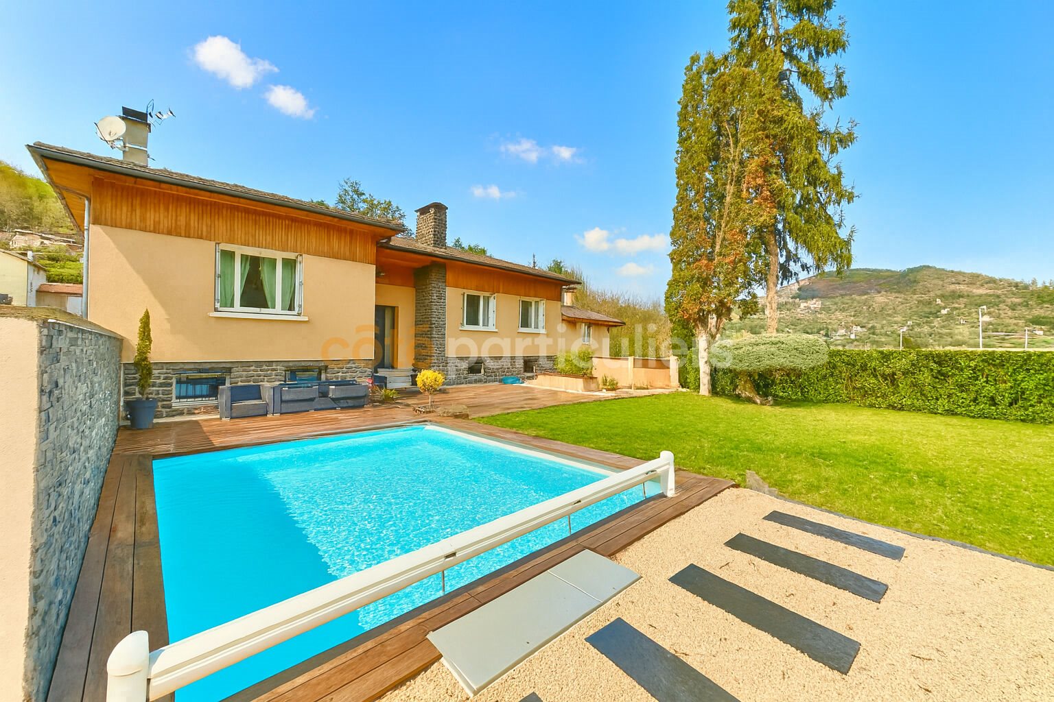 Votre agence Côté Particuliers Le Puy-en-Velay, vous propose : Cette maison située sur la commune d'Espaly-Saint-Marcel, à 5 minutes du Puy-en-Velay, sur un terrain clos et arboré de 1 534 m² avec piscine. La maison d'une superficie de 185 m² habitables sur un seul niveau a été entièrement rénovée, se compose d'un salon/séjour lumineux donnant sur une cuisine entièrement q aménagée, un dégagement desservant trois chambres dont une grande chambre avec dressing et espace bureau, une grande salle de jeux, une salle d'eau avec douche et baignoire et des toilettes séparées. En rez-de-chaussée, un hall d'entrée avec un espace buanderie/chaufferie. En annexes : un atelier, deux garages, une cave et un abri voiture. A ce même niveau, une dépendance de 110 m² comprenant un salon/séjour avec poêle à bois, une cuisine séparée, un dégagement desservant trois chambres, une salle de bains, une salle d'eau et des toilettes. 357 000 Euros Frais d'agence inclus 345 000 Euros Hors honoraires d'agence 12 000 Euros Honoraires d'agence Ttc