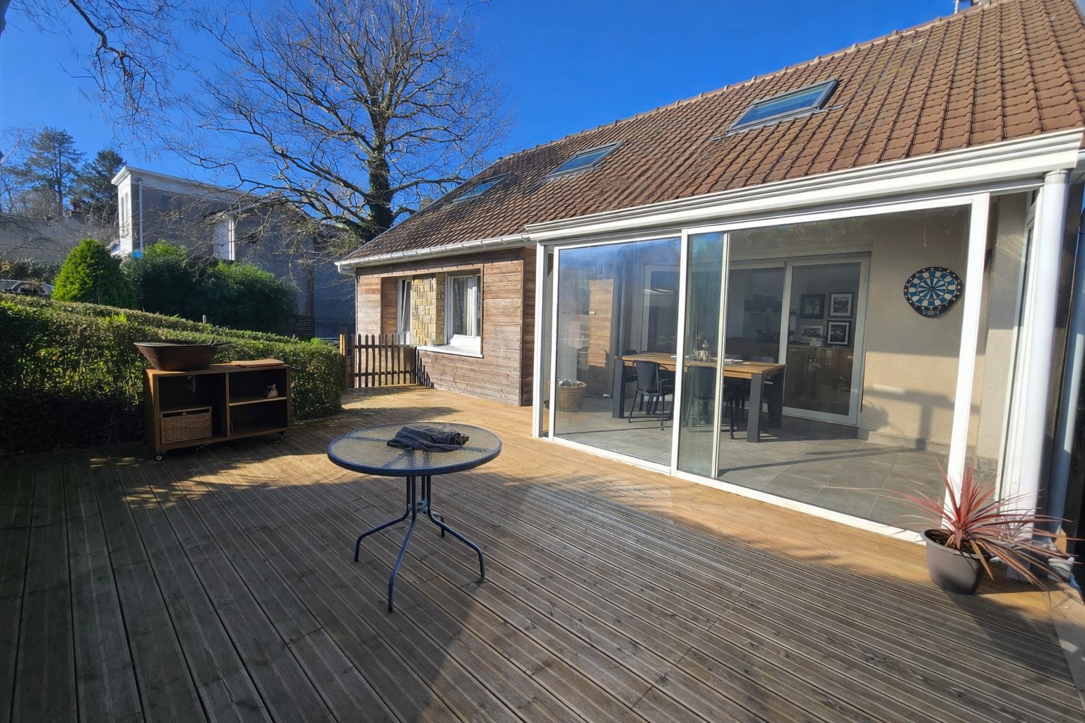 La-Capelle-Les-Boulogne Ref: 15938mb Découvrez cette charmante maison située à La Capelle-lès-Boulogne. Construction des années 80 rénovée au goût du jour, cette maison avec vie de plain pied offre un bel espace de vie avec cuisine ouverte aménagée équipée, un salon séjour avec poêle à pellets et véranda, une chambre, un dressing et une salle de bains au rèz-de chaussée. A l'étage on retrouve un palier, 2 chambres et une salle de bains. Les + : sous sol complet avec coin buanderie, atelier, garage... Pas de travaux CLASSE Energie: C Prix : 389 900 €Uros FAI Infos et visites : ou Marine Bouloy Cuvillier agent commercial Rsac: