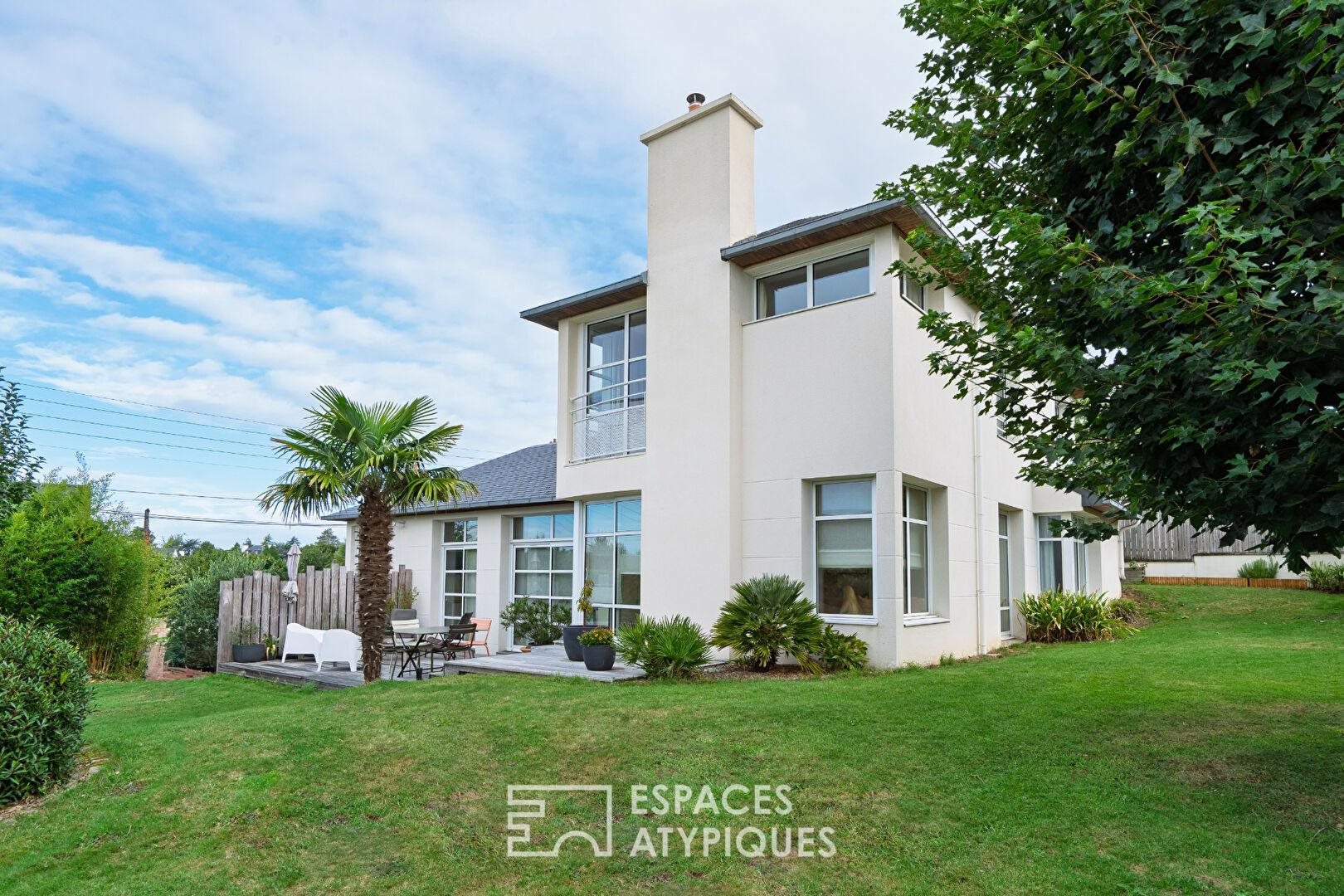 Implantée dans un secteur particulièrement recherché de Morlaix, au sein d’une rue très calme et confidentielle, cette maison bénéficie d’un environnement privilégié, sans aucun vis-à-vis, où le calme et l’intimité sont pleinement préservés. Réalisée en 2002 par un architecte de renom, elle conjugue avec justesse qualité architecturale, volumes généreux et confort de vie. Son implantation idéale permet de rejoindre le centre-ville de Morlaix à pied, ses commerces, services et lieux de vie, tout en bénéficiant d’une desserte par les transports en commun facilitant les déplacements du quotidien. Dès l’entrée, le hall d’accueil structure les circulations et donne le ton. La maison s’ouvre ensuite sur une vaste pièce de vie, véritable coeur de l’habitation. Le salon-séjour séduit par sa triple exposition et ses grandes ouvertures qui laissent entrer la lumière à toute heure de la journée. Le poêle, subtilement intégré, vient réchauffer l’atmosphère et renforcer le caractère convivial de cet espace aux volumes rares. Dans le prolongement, la vaste cuisine aménagée et équipée, de belle facture, s’inscrit naturellement dans la continuité des espaces de vie. Fonctionnelle et élégante, elle profite d’une belle hauteur sous plafond de 2,80 m, de larges baies vitrées et d’un accès direct à la terrasse extérieure, offrant une relation dedans-dehors fluide. Le rez-de-chaussée accueille également une suite parentale parfaitement isolée, pensée comme un véritable espace intime. La chambre, baignée de lumière, dispose d’un dressing et d’une salle d’eau indépendants, ainsi que d’un espace lingerie avec placards, très fonctionnel, pouvant aisément être aménagé en chambre supplémentaire ou en bureau dédié au télétravail. Un Wc indépendant complète ce niveau. À l’étage, la maison propose quatre chambres confortables, toutes équipées de placards intégrés. Les volumes demeurent harmonieux et bien proportionnés, avec de grandes ouvertures qui garantissent une luminosité constante. Certaines pièces bénéficient d’ouvertures d’angle, renforçant la sensation d’espace. Une salle de bain familiale, équipée d’une baignoire, d’une douche séparée, ainsi qu’un Wc indépendant, répondent parfaitement aux besoins d’une vie de famille. Un grenier complète ce niveau et offre un espace de rangement supplémentaire. Les extérieurs clos, soignés et harmonieusement aménagés, prolongent les espaces de vie dans un cadre préservé de tout vis-à-vis. La maison dispose d’un vaste garage attenant, ainsi que d’une dépendance-atelier d’environ 26 m², idéale pour le stockage, un atelier ou un espace créatif ou une cuisine d’été. Côté confort, la maison est chauffée au gaz de ville grâce à une chaudière récente et est raccordée au tout-à-l’égout. Parfaitement entretenue et en excellent état général, cette propriété ne nécessite aucun travaux et peut être investie immédiatement. Une maison d’architecte contemporaine à l’architecture singulière, où lignes, hauteurs et ouvertures composent une écriture résolument lumineuse, faisant de ce lieu un bien rare, conjuguant architecture, confort et sérénité. Contact : Sandrine