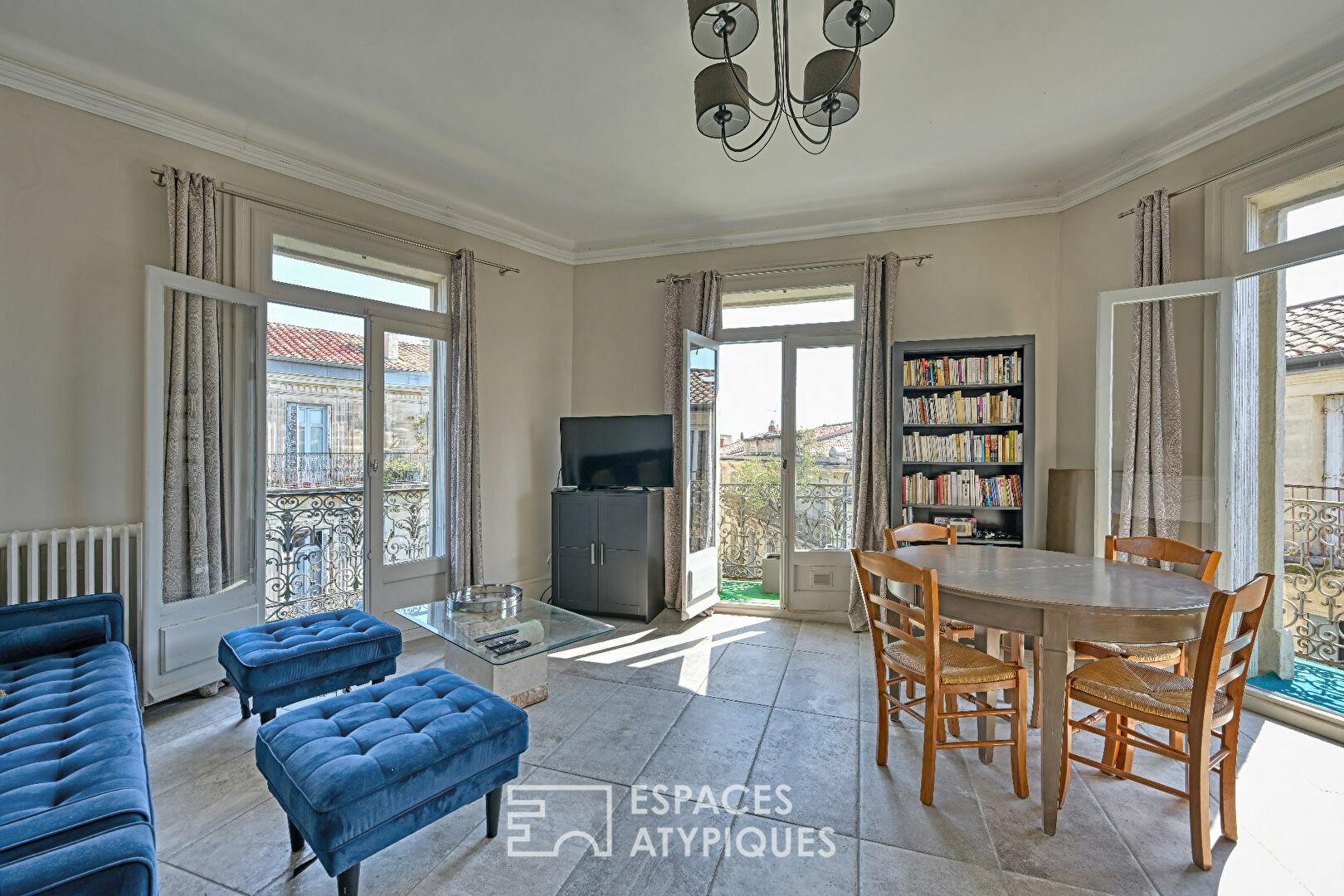 Situé en plein coeur de Montpellier, à proximité immédiate des commodités, des transports et de la gare, cet appartement de 102,45m² carrez se niche au dernier étage d’un immeuble ancien de caractère. Ce bien traversant se compose de quatre pièces principales : une entrée avec couloir distribuant trois chambres, une salle d’eau, un Wc indépendant, une cuisine séparée et un séjour d’angle baigné de lumière. L’appartement a récemment bénéficié d’une rénovation soignée, mettant en valeur son cachet d’origine. Les sols, les tomettes anciennes, les plafonds généreux et les moulures d’époque confèrent aux espaces une atmosphère chaleureuse et authentique. Le séjour, situé à l’angle de l’immeuble, offre une double exposition et une vue dégagée sur les toits de la ville et sur l’Arc de Triomphe. Chaque pièce dispose d’une ouverture sur l’extérieur, renforçant la sensation d’espace et de clarté. Un balcon filant prolonge l’ensemble de l’appartement. Il dessert toutes les pièces et permet de profiter pleinement du panorama urbain et du charme du bâti ancien environnant. L’immeuble, dont la toiture et les parties communes ont été récemment refaites, témoigne d’un entretien rigoureux de la copropriété. Perché au quatrième et dernier étage, ce bien surplombe les toits montpelliérains et conjugue le confort d’un logement rénové avec l’âme d’un lieu chargé d’histoire. Ses beaux volumes, son agencement traversant, la lumière omniprésente et son adresse centrale en font une jolie propriété. CLASSE Energie : D – 186 / Classe Climat : D – 40 Montant moyen estimé des dépenses annuelles d’énergie pour un usage standard, établi à partir des prix de l’énergie des années 2021, 2022, 2023 : entre 1720€/an et 2370€/an. Les informations sur les risques auxquels ce bien est exposé sont disponibles sur le site Géorisques pour les zones concernées.