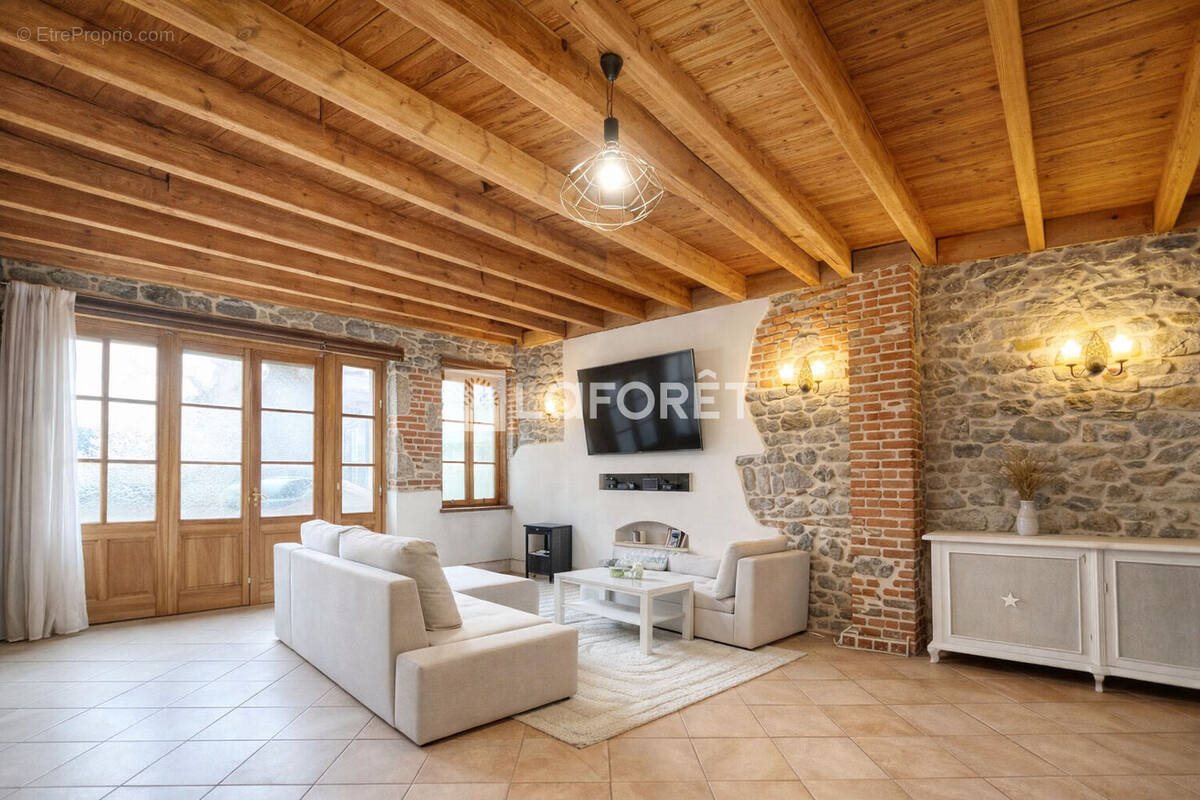 Située en plein coeur d'Ambierle, village prisé de la Côte Roannaise, cette maison en pierre rénovée développe environ 154 m² habitables et offre un potentiel rare pour un projet de vie évolutif ou une activité indépendante. Entièrement rénovée en 2021 puis rafraîchie en 2025, elle allie le cachet de l'ancien (pierre apparente, poutres, volumes) au confort moderne. Au rez-de-chaussée, vous découvrez un vaste salon-séjour d'environ 54 m², chaleureux et lumineux, avec cuisine aménagée et équipée ouverte sur l'espace de vie. Une salle de bains avec baignoire complète ce niveau, ainsi que plusieurs espaces fonctionnels : atelier, buanderie, cellier et cave. A l'étage, l'espace nuit se compose de trois chambres, d'un bureau et d'une salle d'eau. Un atout majeur distingue ce bien : une spectaculaire salle de jeux d'environ 60 m². Cet espace peut facilement devenir : salle de loisirs ou home cinéma salle de sport atelier artistique chambres supplémentaires espace professionnel En complément, une pièce indépendante d'environ 50 m² reste à aménager selon vos besoins : bureau indépendant, activité libérale, studio, extension de l'habitation ou stockage. Un grand garage d'environ 50 m² permet de stationner plusieurs véhicules ou d'aménager un espace de travail. Les points clés : Maison en pierre au centre d'Ambierle 154 m² habitables Salon-séjour de 54 m² 3 chambres + bureau Salle de jeux de 60 m² Pièce indépendante de 50 m² à aménager Garage de 50 m² Chauffage individuel gaz Menuiseries bois double vitrage Rénovation récente Ce bien s'adresse à ceux qui recherchent plus qu'une maison : un espace évolutif capable d'accompagner un projet familial, professionnel ou créatif. Un produit rare sur le secteur d'Ambierle, offrant volumes, caractère et possibilités d'aménagement. Pour plus d'informations ou organiser une visite, contactez votre agence Laforêt Roanne au [Coordonnées masquées].