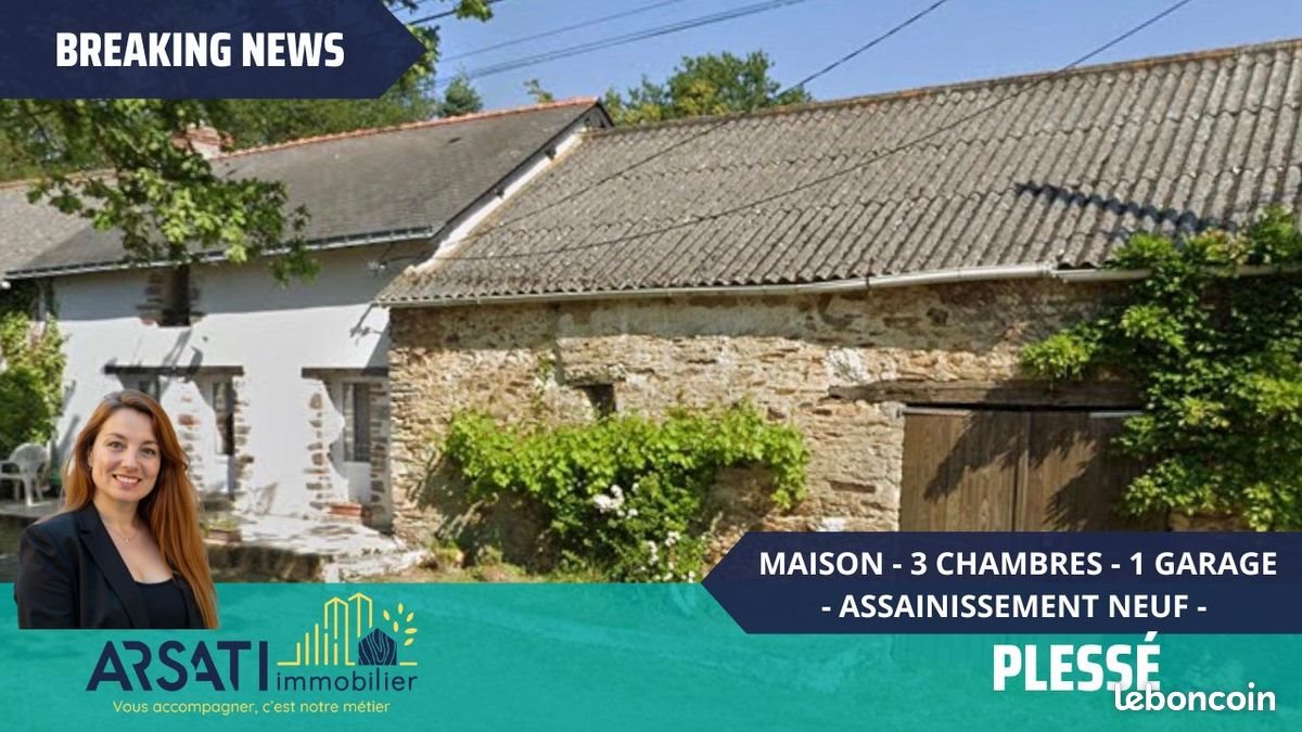 Plesse 3 Chambres 1 Sdb 1 Sde - 1 Garage / Grange Assainissement Neuf Nouveaute sur Plesse, chez Arsati IMMOBILIER Arsati immobilier vous présente votre future demeure : une maison de 5 pièces nichée en compagne 83 m² habitables et un garage/ grange de 65M² attenant à la maison. Elle se compose de la manière suivante : Au rez-de-chaussée : -une pièce de vie - une cuisine - une chambre - wc - une salle de bain - un garage/ grange 1er étage : deux chambres une salle d'eau - une mezzanine Cette maison offre également un extérieur avec deux terrasses Et un assainissement neuf. Pour une expérience unique, contactez-nous dès maintenant pour organiser une visite. Votre futur chez vous vous attend avec impatience. Avis De L'expert : Les plus sur cette maison sont bien évidemment son charme, le calme de la campagne et son assainissement neuf. Pour plus d'informations, n'hésitez pas à nous . Images retouchées pour épurer les volumes. Arsati Immobiler, vous accompagner c'est notre métier!! Honoraires à la charge du vendeur. Classe énergie D, Classe climat B Montant moyen estimé des dépenses annuelles d'énergie pour un usage standard, établi à partir des prix de l'énergie de l'année 2021 : entre 1326.00 et 1796.00 . Les informations sur les risques auxquels ce bien est exposé sont disponibles sur le site Géorisques : . Votre conseiller Arsati Immo : Elodie HENRY Agent commercial (Entreprise individuelle)