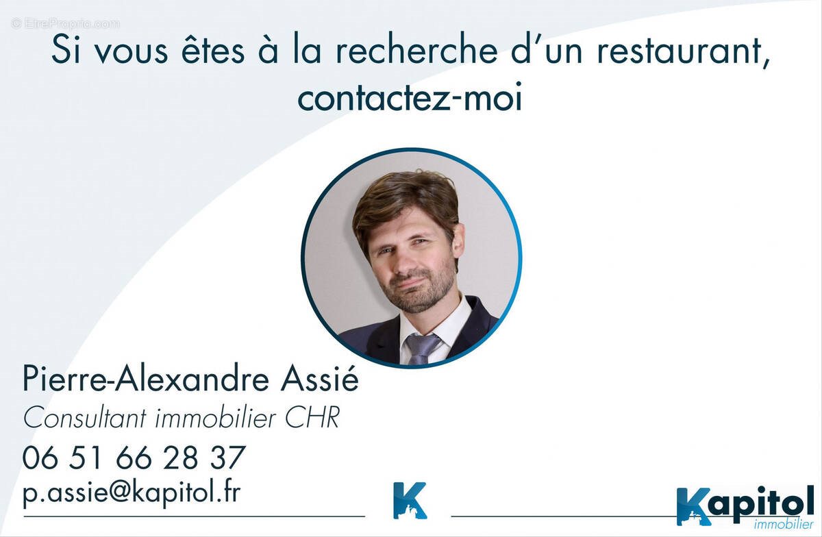 Paris 4 - Cession de fonds de commerce de petite restauration à 1 minute de la bastille. Il y a une forte présence de bureaux et une clientèle aisée Ce petit restaurant comprend : - Superficie totale de 38 m² - 8 places en salle - Loyer trimestriel de 7612 cc - Clientèle aisés, bureaux, habitués Affaire parfaite pour du midi... Contactez Pierre-Alexandre Assié au [Coordonnées masquées] Retrouvez nos annonces de fonds de commerce de bar à acheter ou vendre sur Votre conseiller Kapitol Immobilier : Pierre-Alexandre Assié Agent commercial (Entreprise individuelle). Pour plus d'informations merci de prendre contact avec le négociateur: