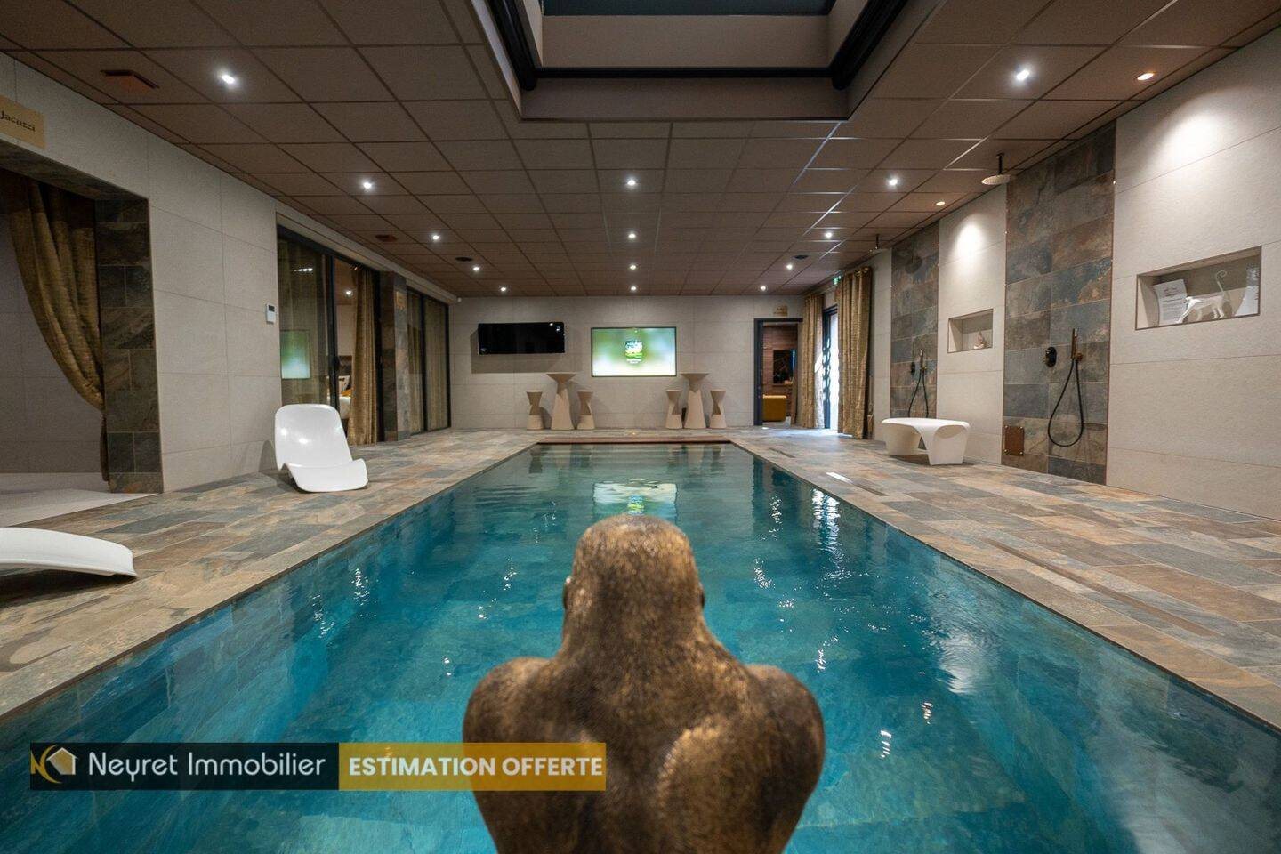 Saint-Priest-En-Jarez, Unique à Saint Etienne, à proximité de l'hopital nord, l'étrat Dans résidence luxueuse de 3 lots, Appartement type maison de plain pied de 316M2 comprenant 1 cuisine équipée haut de gamme ouverte sur séjour salon de 60m2 donnant accès à une terrasse de 50m2 exposée plein sud avec bannes extérieures, 3 belles chambres de 13,30m2, 13,85m2 et 12,84m2, salle d'eau en marbre avec vasque et sèche-serviettes. de l'appartement par un escalier en colimasson vous accderez à une piscine de 9X3 chauffé avec volet immergé polycarbonate noir 2 suites de 26 Et 24M2 equipée de cuisine integres dont une avec un patio, espace jaccuzzi 6 personnes de 19M2, salle de bain, hammam 8 personnes 3 Places De Parkings Prive Garage de 30m2 carrelé isolé avec sa cour privée de 35m2 . Garage De 22M2 chauffage pompe à chaleur, clim et plancher chauffant, panneaux photovoltaïques, diffusion sonore, alarme, vidéo surveillance, domotique etc... Venez découvrir sans tarder ! M.Adamo O6 .