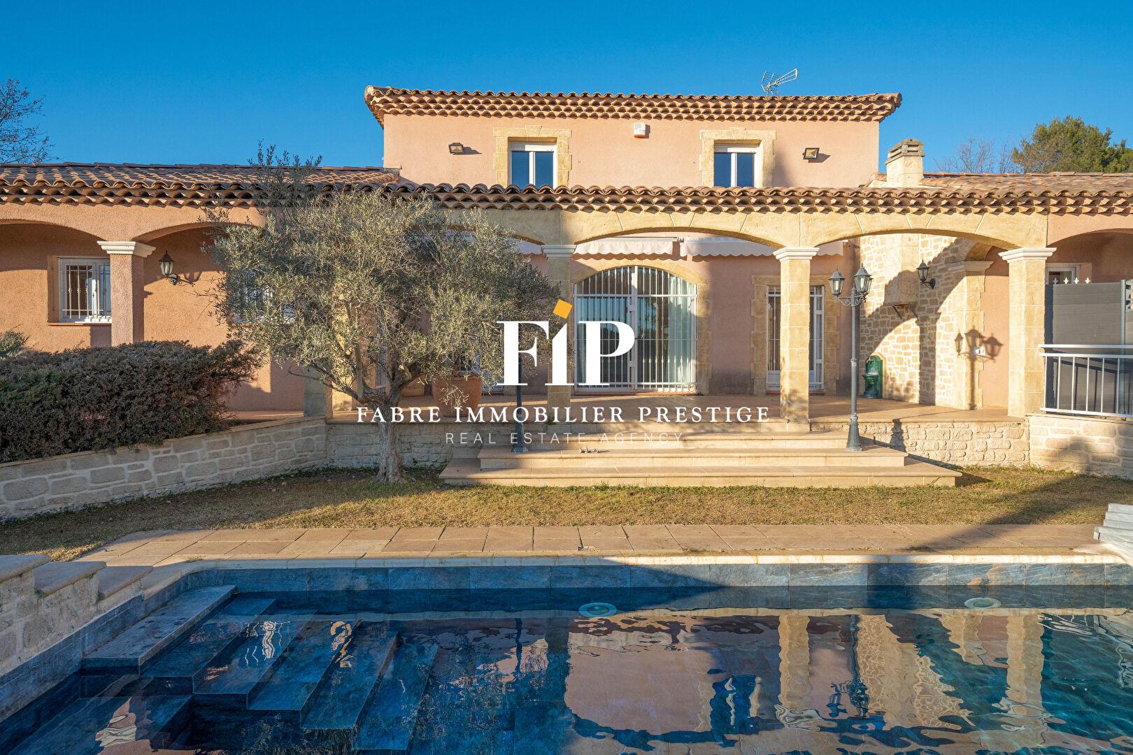 Exclusivité Fip - Fabre Immobilier Prestige : A 30 minutes d'Aix-en-Provence, non loin des accès autoroutiers, sur la commune de Saint-Maximin-la-Sainte-Baume, au calme absolu et nichée au coeur d'un quartier résidentiel réputé, propriété de 310m2 habitables composée d'une maison d'architecte de 235 m2 habitables et d'une maison d'amis de 75m2. Sur un parc boisé de 2770 m2 et profitant d'un forage, cette propriété avec vue dégagée sur la ville dégage une grande sérénité. La maison, en hauteur, exposée sud et solide construction des années 2000, se présente comme suit: Hall d'entrée, spacieuse cuisine dinatoire de 24 m2 , un double séjour de 80 m2 avec cheminée s'ouvrant sur la grande terrasse. Un grand escalier mène à l'étage qui profite d'une vaste suite parentale et de deux chambres supplémentaires partageant une salle de bains. Buanderie. Au prolongement de la maison, au rez-de-chaussée, un bel espace avec une cuisine américaine ouverte sur le salon, une chambre, un dressing et sa salle d'eau contemporaine. Idéale pour accueillir des invités, pour vos projets personnels et pour un bon rapport locatif, la dépendance de 75 m² est constitué d'un séjour cuisine de 32 m2 avec cheminée et terrasse , deux chambres et un bureau, une salle de bains et wc séparé. Deux entrées indépendantes existantes. Une très belle piscine 14 x 7 sécurisée ainsi qu'un jacuzzi, parfaitement intégrée à l'ambiance végétale de la propriété. Quatre garages et un grand carport pour plusieurs voitures. Le cadre enchanteur et le bâti imposant, 55 m de longueur, sans renier son architecture provençale, profitant d'un nombre important de chambres, confèrent à cette propriété familiale une qualité et un confort de vie évidents. Assainissement individuel Contact : Serge Hadida Mail : Mobile: +33 (6). Prix de vente (net vendeur): 1.285.000 Honoraires (charge acquéreur): 65.000 Ttc, soit 5.06% Ttc Prix de vente (honoraires d'agence inclus): 1.350.000 Les informations sur les risques auxquels ce bien est exposé sont disponibles sur le site Géorisques €1 350 000 honoraires inclus | €1 285 000 hors honoraires | Honoraires : 5.06% Ttc à la charge de l'acquéreur Nos honoraires