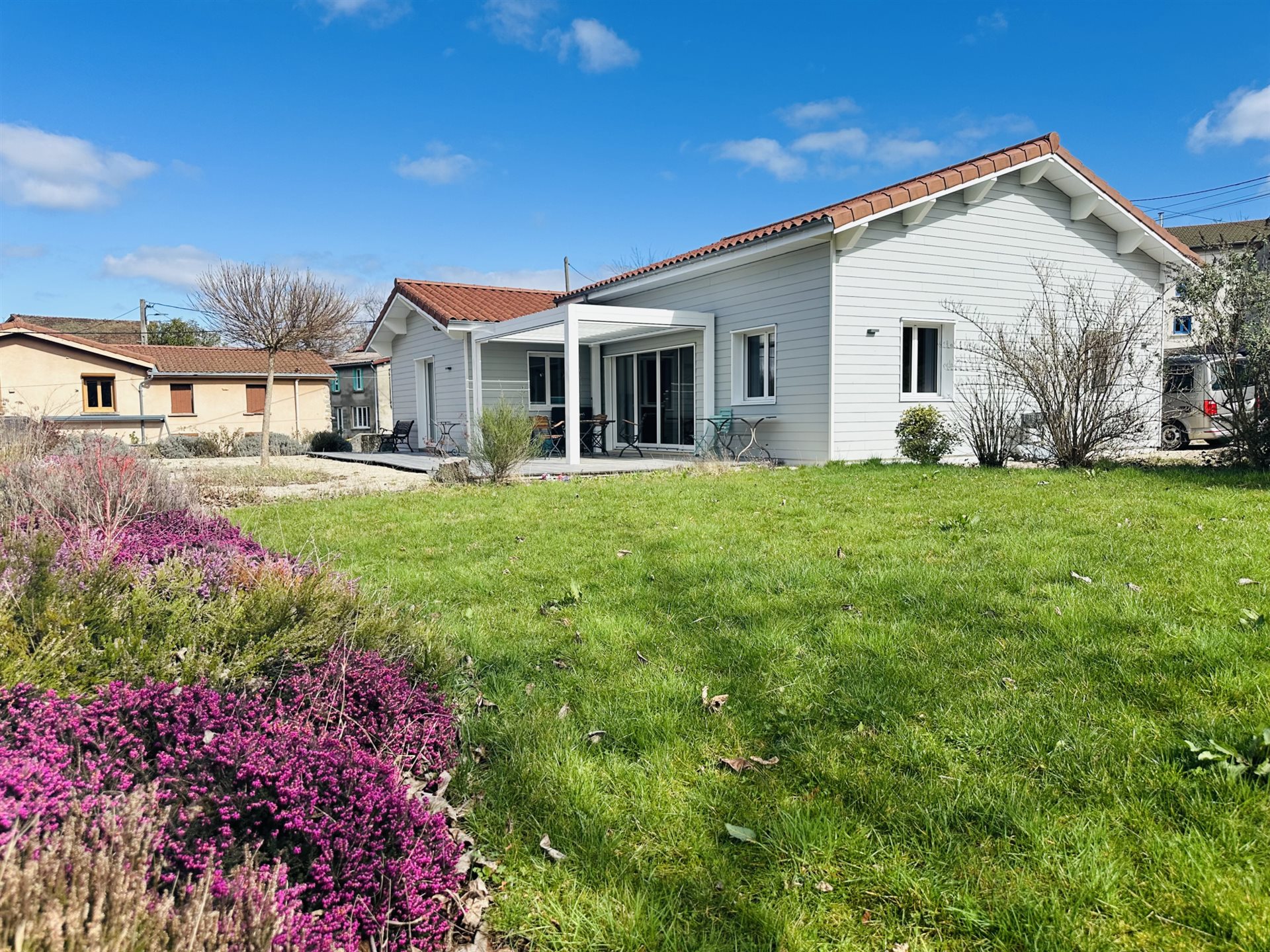 Située sur la commune de Viscomtat, cette maison de caractère construite en 2019 vous séduira par ses prestations modernes et sa luminosité exceptionnelle. Une fois la porte franchie, vous découvrirez une vaste pièce de vie baignée de lumière, offrant de beaux volumes, ouverte sur une superbe cuisine entièrement équipée, alliant esthétique et fonctionnalité. Une mezzanine complète cet espace et constitue un lieu idéal pour un bureau ou un coin détente. Les deux chambres disposent chacune de leur propre salle de bain ainsi que de Wc, garantissant confort et intimité. À l'extérieur, vous profiterez d'une grande terrasse aménagée, équipée d'une pergola bioclimatique, parfaite pour partager des moments conviviaux en toute saison. Deux annexes viennent compléter ce bien, implanté sur un terrain spacieux de 1 855 m2, offrant calme et cadre naturel privilégié. Un bien rare, alliant confort moderne et charme, à découvrir sans tarder.