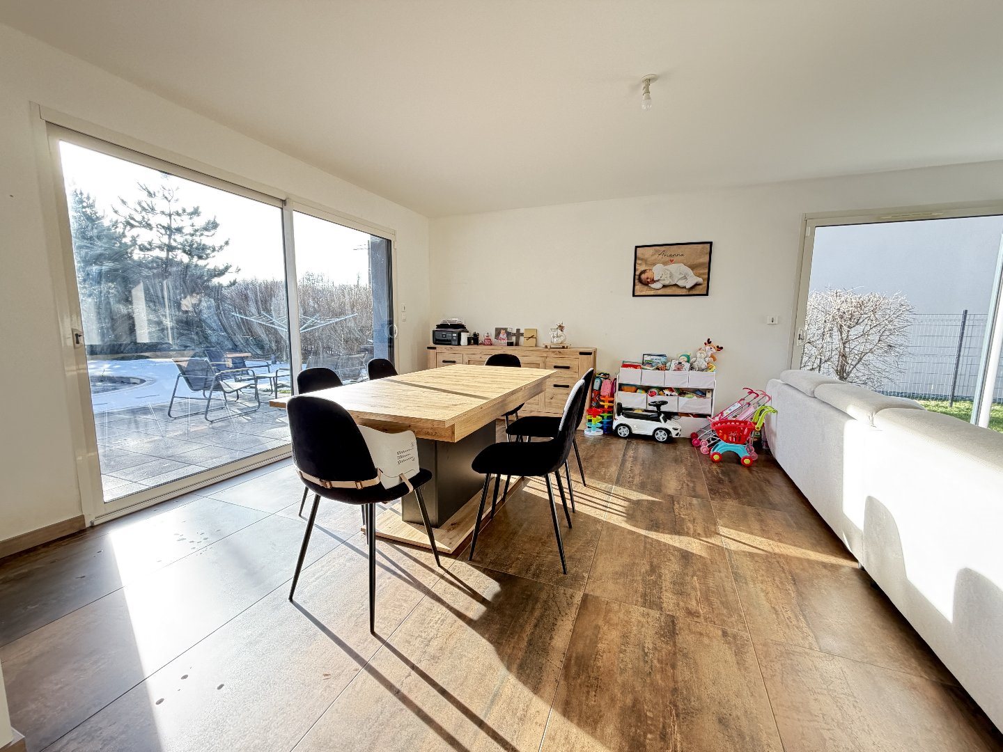 L'agence Immobilière du Château vous propose cette maison de plain-pied, construite en 2013, située sur la commune de Dasle, appréciée pour sa qualité de vie, sa proximité avec Montbéliard et la frontière suisse. D'une surface habitable de 100,50 m², elle se compose d'une lumineuse pièce à vivre avec cuisine ouverte sur le salon-séjour, offrant un espace convivial et fonctionnel. La partie nuit comprend 3 chambres (dont une avec dressing), une salle de bains ainsi qu'un Wc séparé. Un cellier / buanderie complète l'espace intérieur et donne accès à un garage attenant à la maison. À l'extérieur, vous profiterez d'un terrain de 12,36 ares avec piscine, idéal pour les beaux jours et les moments de détente. Vous bénéficierez d'un cadre verdoyant, tout en restant à proximité des commodités, des écoles et des principaux axes. Venez vite la découvrir !