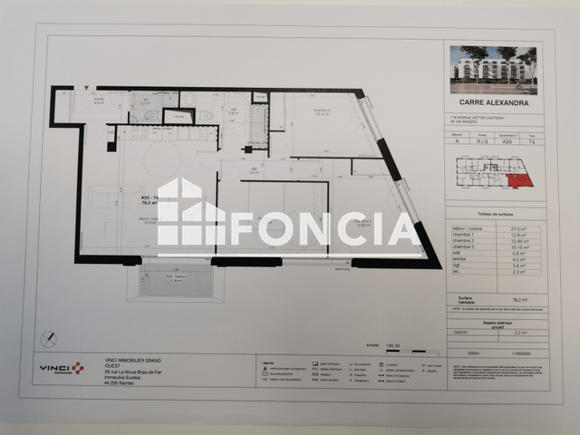 - PAS D'HONORAIRE D'AGENCE - LOCATION SOUMISE A CONDITIONS - ANGERS - 115 AVENUE VICTOR CHATENAY - Résidence neuve proche des transports et commerces - Agréable appartement T4 lumineux situé au 3ᵉ étage avec ascenseur, balcon et place de parking privative.L'appartement comprends une entrée avec placard, un salon-sejour avec coin cuisine équipée, une salle de bains avec WC,un dégagement, une salle d'eau avec WC, trois chambres dont deux avec placard.