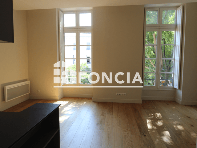 Studio de 29,55m2, un hall avec placard, une pièce à vivre avec cuisine aménagée et semi équipée (frigo, plaques, hotte), salle d'eau/ toilettes