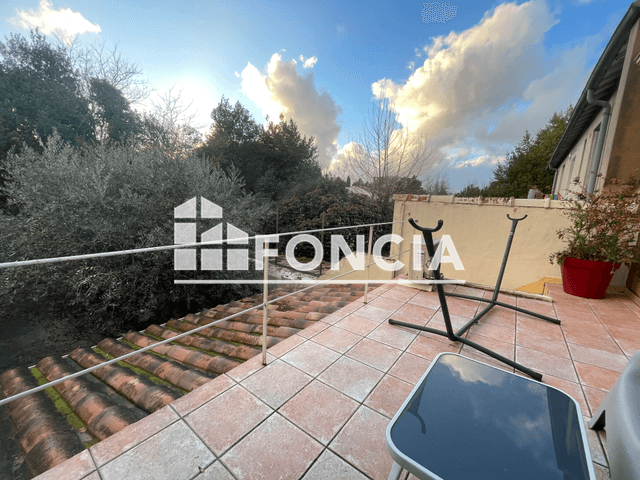 Une maison de village à étage avec grande terrasse/jardin comprenant : un séjour avec coin cuisine, deux chambres, une salle d'eau et un wc séparé.