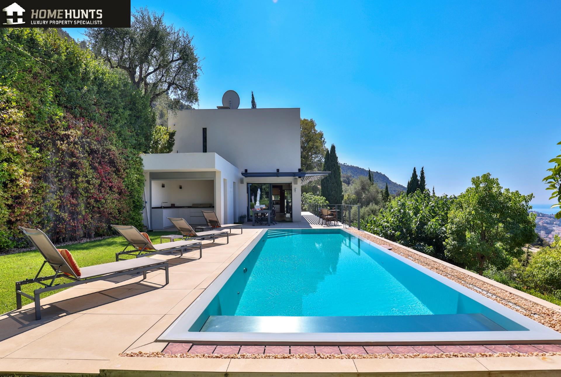 Nice Grande Corniche/Vinaigrier: Built on 1700 m2 of wooded grounds, superb renovated villa with luxurious appointments. This property enjoys a very beautiful panoramic view of the Baie des Anges and benefits from a heated infinity pool with poolhouse and a bowling alley. It consists of a large bright living room with its fitted and equipped open kitchen, four bedrooms and four bathrooms as well as an independent 1 bedroom guest apartment. Five parking spaces complete this superb property.
