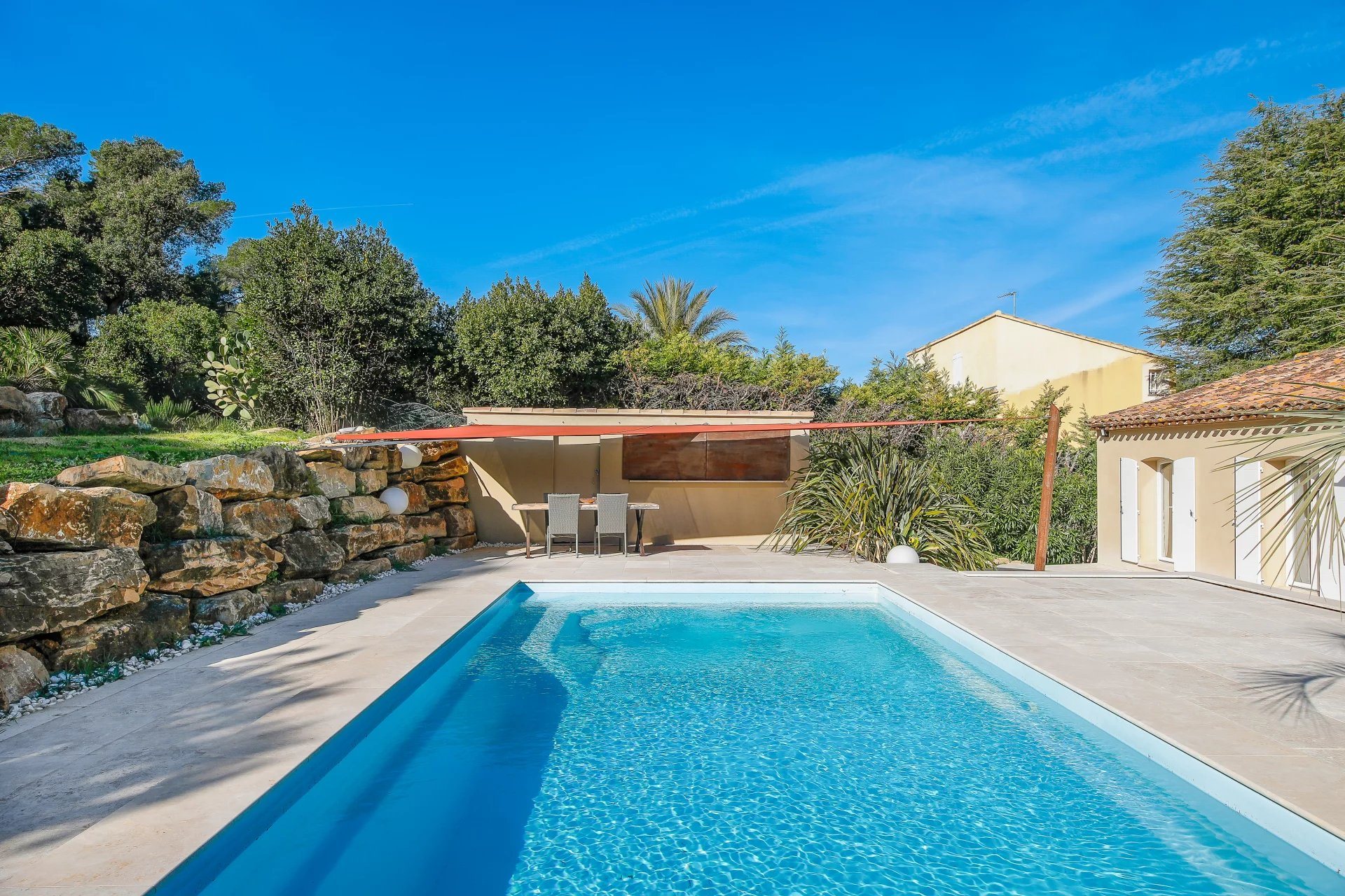 Located in a highly sought-after residential area of Carqueiranne, this south-facing villa enjoys a privileged setting and generous outdoor spaces, perfect for embracing the Mediterranean lifestyle all year round. With approximately 166 m2 of living space, the main house offers spacious interiors and a warm, welcoming atmosphere. You will discover a bright and expansive living room opening onto a pleasant south-facing terrace â?? ideal for relaxing moments. The large, fully fitted and equipped kitchen is perfect for family meals and entertaining. The sleeping area comprises three bedrooms, a shower room, and separate WC. Outside, everything has been designed to enjoy the Provencal art of living: A swimming pool area with pool house A petanque court for authentic gatherings with family and friends A spacious garden set on a 1,674 m2 plot, offering privacy and numerous possibilities for further landscaping A true additional asset: an independent one-bedroom apartment (T2) with its own terrace – ideal for hosting guests, generating rental income, or running a professional activity. A large garage with ample storage space, along with a versatile additional area (workshop, gym, office, etc.), completes this property. Ideally located in the charming seaside resort of Carqueiranne, the villa benefits from immediate proximity to Hyères, with its international airport, train station, and motorway access – combining residential tranquility with excellent accessibility. A property with many advantages, perfectly suited as a primary residence or a holiday home. Contact us today to find out more.