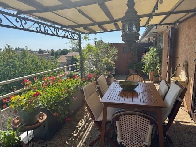 Tramoyes, à 2 pas du Centre et au calme, dans une petite et agréable copropriété de 6 lots située au 2 ème et Dernier Etage. L'appartement offre une atmosphère unique " comme une maison ". Nous vous proposons un appartement de 80 m2 ( 65 m2 Carrez ) plus 44 m2 de terrasse exposée en Sud Ouest La pièce de vie de 38 m2 est lumineuse grâce de nombreuses portes fenètres qui s'ouvrent directement sur une large terrasse de 44 m2. Vue Dégagée. La cuisine est équipée et aménagée. L'espace nuit avec 2 chambres, une salle de bains et un Wc indépendant. La bonne surprise d'une buanderie et d'un dressing. Nombreux rangements. Plus 2 abrits de jardin. La climatisation est en place. Les diagnostics sont bons Une place de stationnement inclus. Un garage double en supplément du prix. Petite copropriété entretenue et parfaitement bien gérée.