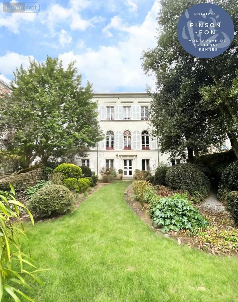 Rennes 35000 - Superbe hôtel particulier du XIXe siècle, alliant tout le charme de l'époque avec ses moulures, boiseries, cheminées et parquet ancien. Cette demeure d'exception s'ouvre sur une belle entrée carrelée, menant à un élégant salon sur parquet avec cheminée de plus de 30 m², prolongé par un boudoir de 12 m². Une magnifique salle de réception communique avec une cuisine dinatoire, offrant un espace convivial. Un bureau pouvant faire office de chambre, un placard et des Wc complètent ce rez-de-chaussée. Un majestueux escalier mène au premier étage, qui accueille cinq chambres, dont une suite parentale avec salle d'eau et dressing privatifs, une salle de bain, un cabinet de toilette et des Wc. Au dernier étage, un dégagement sur tommettes dessert une spacieuse chambre mansardée de plus de 22 m² et un ensemble de greniers aménageables selon vos envies. Le sous-sol comprend une vaste cave, un espace chaufferie, une buanderie, un bureau et un salon d'été s'ouvrant sur un superbe jardin clos de murs, exposé plein sud et à l'abri des regards. Un accès indépendant permet d'envisager l'aménagement d'une activité professionnelle. Deux dépendances situées au nord n'attendent qu'une rénovation pour révéler tout leur potentiel.le tout sur un terrain 800m²ETUDE Pinson Eon - Montauban de Bretagne / Rennes