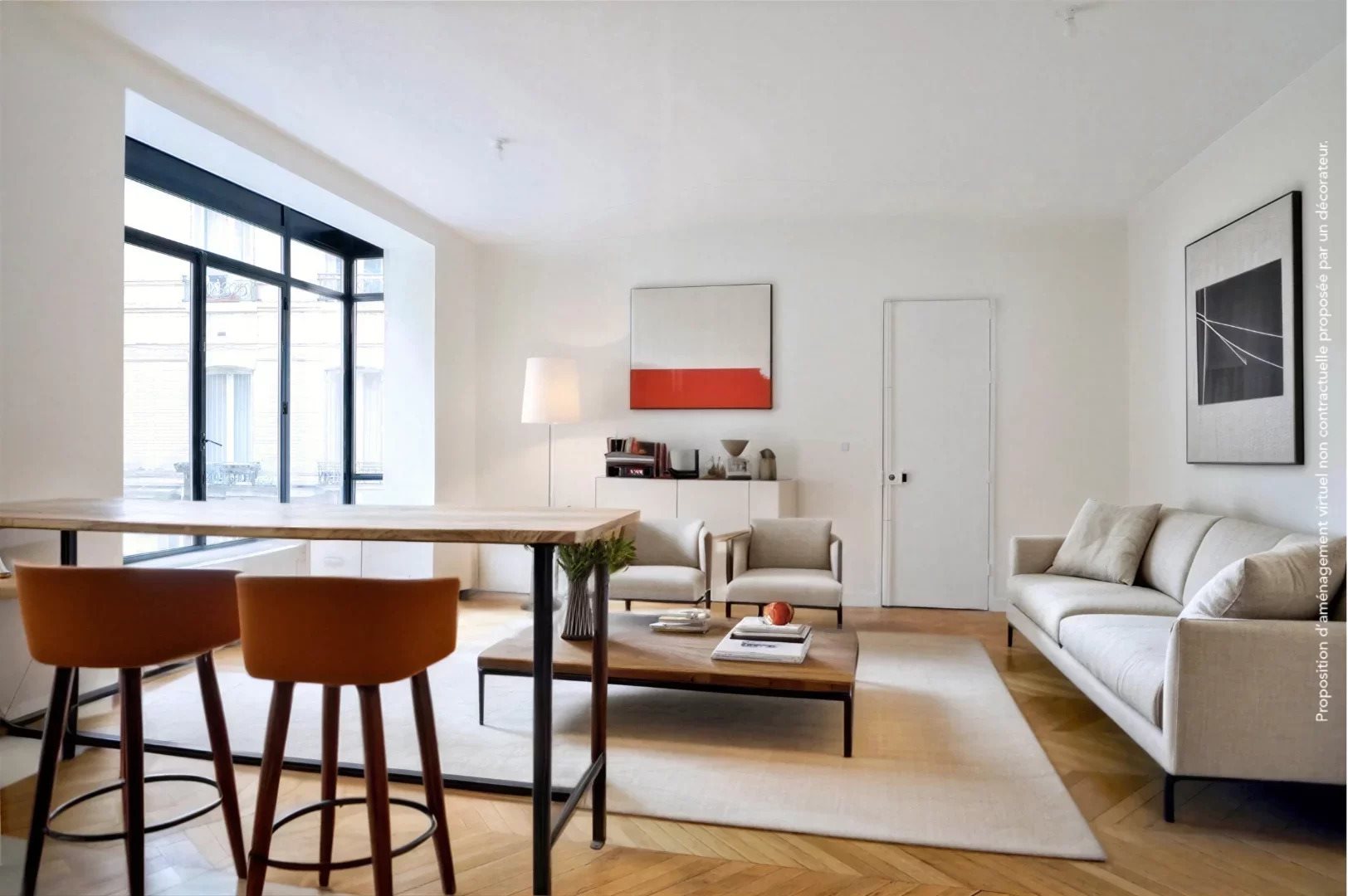 Dans un superbe immeuble en pierre de taille avec gardien et ascenseur, cet appartement de 61,18m² loi Carrez, au premier étage, a fait l'objet d'une rénovation totale. Il est orienté au calme absolu sur une cour végétalisée et se compose d'un grand salon agrémenté d'un élégant bow-window, d'une cuisine ouverte équipée, de toilettes séparées et d'une grande chambre avec une salle de douche à l'italienne attenante. Le plan compact offre des volumes généreux ainsi qu'une belle hauteur sous plafond de 3m10. Cet appartement "prêt à vivre" est à proximité immédiate de la gare Montparnasse. Deux cagibis complètent cette offre.