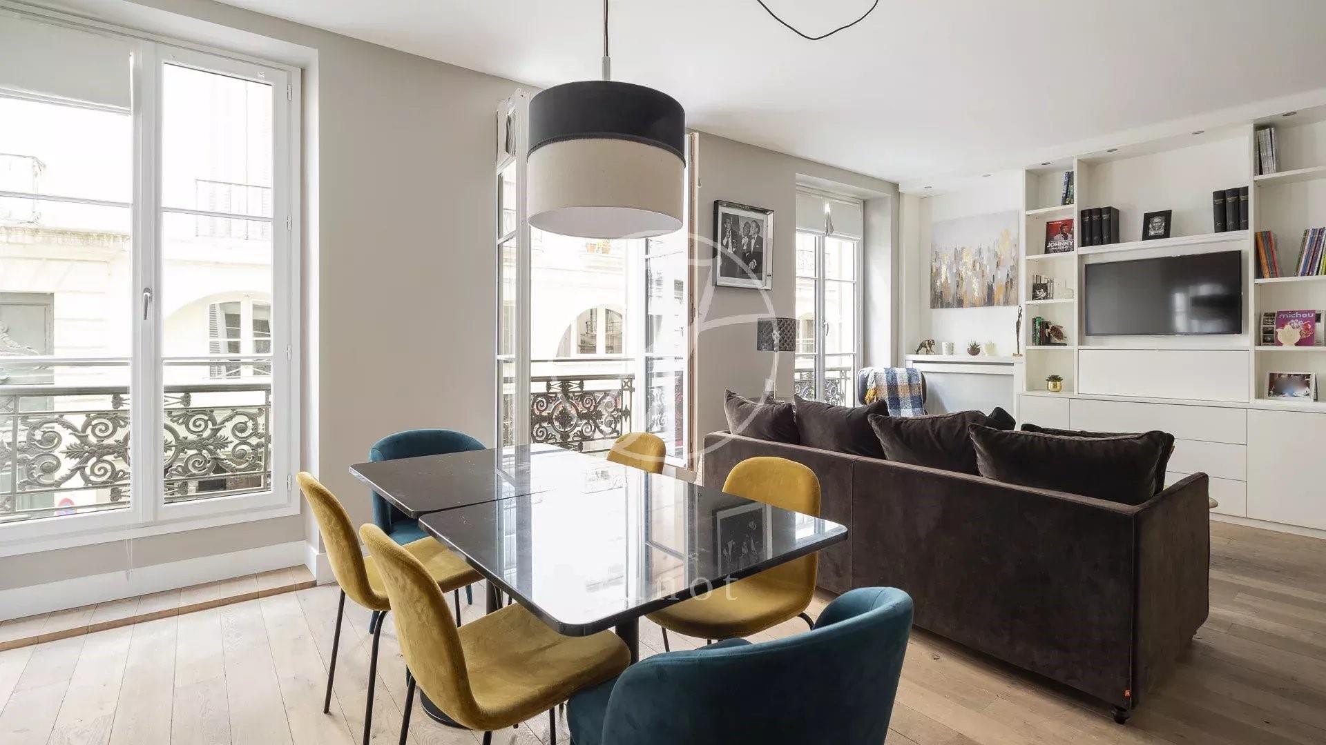 Ideally located in the heart of Saint-Germain des Prés, close to the Carrefour de la Croix-Rouge and the shops on boulevard Saint-Germain, this 60.60 m² loi Carrez flat on the first floor by lift of a building with outstanding communal areas is ideal for a pied-à-terre. In perfect condition, this property comprises an entrance hall with storage space, a west-facing double living room opening onto a fitted and equipped kitchen with a glass roof, a pleasant bedroom overlooking the courtyard with its own dressing area, a shower room and separate toilet. A cellar completes this offer.EXCLUSIVITY.