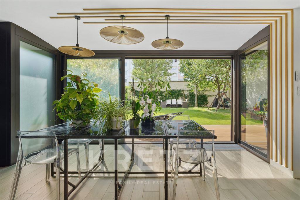 Exclusivité. Boulogne Porte de St Cloud. Dans un immeuble récent, appartement de 126 m2 entièrement refait à neuf avec terrasse et jardin arboré de 148 m2 au calme orientés plein sud. Entrée sur salon avec cheminée et sonorisation Bose 5.1. Cuisine séparée entièrement équipée avec cave à vin intégrée et verrière. Salle à manger sous une pergola ouvrant sur la terrasse aménagée et le jardin. Chambre parentale de plain pied sur terrasse avec salle de douche. 2 chambres d'enfants. 1 salle de bain. 2 bureaux. Buanderie. Alarme. 1 cave. 1 parking. A deux pas des commerces et transports, du Tennis Club de Paris (Tcp) et du Parc de l'Ile St Germain.