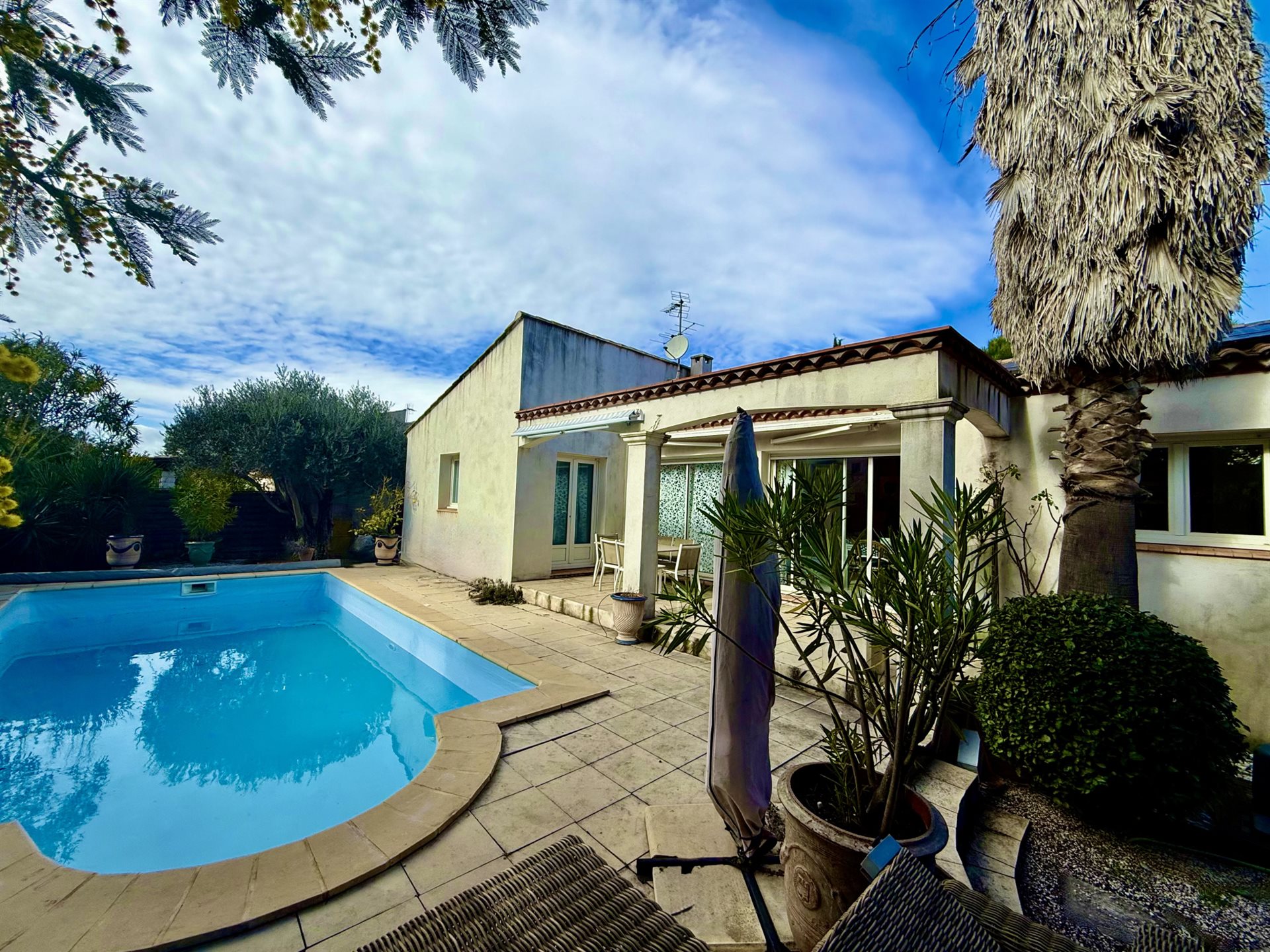 Exclusivite, Vendargues, maison de plain pied T6 parfaitement entretenue proche des commerces, des écoles et de toutes les commodités. Entrée avec placard, lumineuse pièce de vie exposée sud avec cuisine américaine quipée donnant sur la terrasse ensoleillée, 5 chambres avec placards aménagés dont une avec salle d'eau, buanderie, 3 salles d'eau et 3 wc. Piscine chauffée, panneaux solaires, volet roulants électriques, plancher chauffant et raffraichissant par pompe à chaleur air/eau, 2 portails d'accès pour le stationnement, alarme.... Contact Sandra: - Rsac 393 265 038