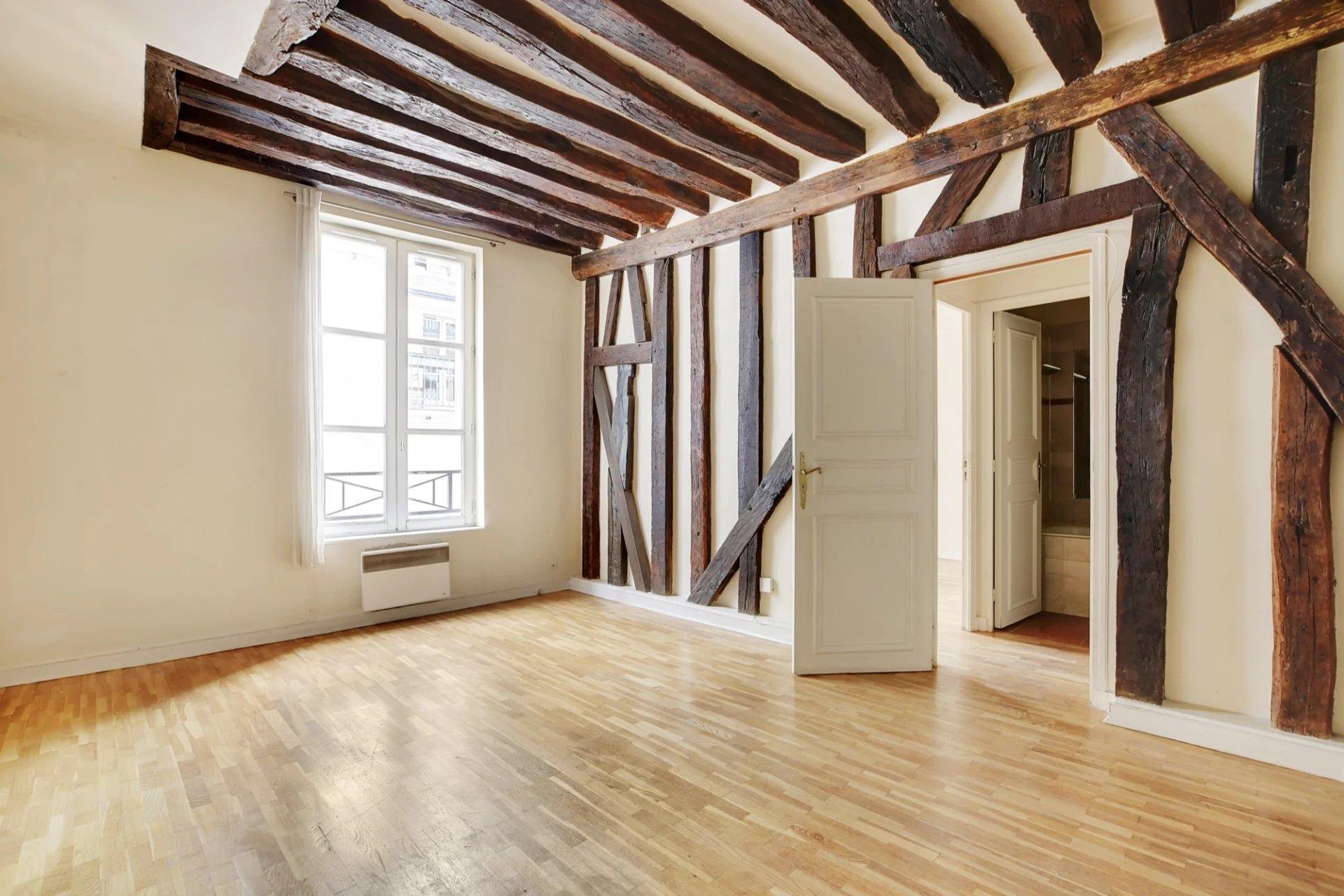 Exclusivite - Paris 1er - rue Vauvilliers Situé dans le quartier des Halles, cœur historique de Paris cet appartement trois pièces offre un cadre de vie exceptionnel, à proximité immédiate de nombreux commerces (dont le Forum des Halles avec ses boutiques et cinémas), cafés et restaurants, ainsi que de plusieurs lignes de métro et Rer. À seulement 5 minutes des quais de Seine et du Marais, vous bénéficiez d'un emplacement central et privilégié, tout en profitant de la tranquillité d'une rue calme. La copropriété est parfaitement entretenue. Dès l’entrée de l’immeuble, les parties communes vous séduiront avec les pierres apparentes et les balustrades en fer forgé. L’Appartement se distingue par son agencement optimisé, sans aucune perte d'espace. Il comprend un vaste salon avec une cuisine américaine, deux chambres, une salle de bains, et un Wc indépendant. Un double salon est également envisageable pour ceux qui souhaitent personnaliser l’espace à leur goût. Les poutres apparentes et le parquet apportent un charme authentique et intemporel à ce bien.