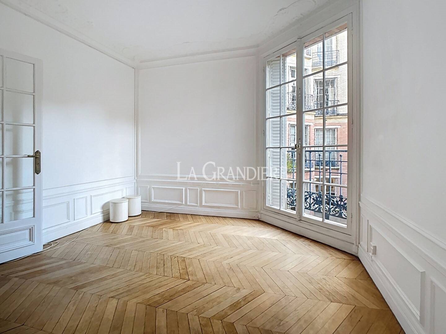Dans un immeuble de standing, au 1er étage sur jardin, agréable appartement comprenant une entrée, un salon, une salle à manger, une chambre, une cuisine séparée aménagée et équipée, une salle de bains et un wc séparé. Parquet, moulures, cheminées, rangements. Cl...