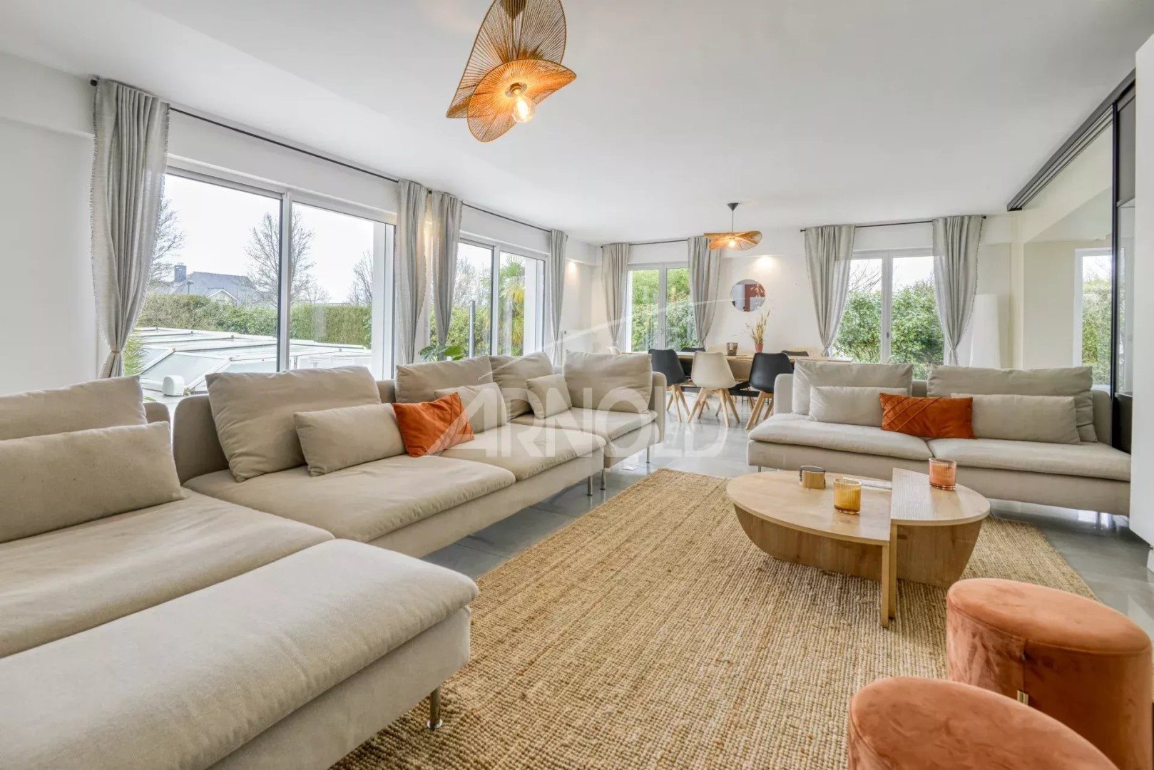 A 20mn de Nantes et à deux pas des commerces et des transports (bus et tram train).Au cœur d'un quartier résidentiel de standing, cette superbe maison d'une superficie d'environ 249m² habitables, 298 m² au sol au total se distingue par son environnement paisible et son cadre de vie privilégié.Elle s'avère être un choix idéal pour une famille en quête de confort et d'espace, offrant un jardin paysager sur une parcelle de 1 500m2.Les volumes généreux de cette demeure en très bon état se répartissent harmonieusement sur deux niveaux. Dès l'entrée, un hall spacieux conduit à une vaste pièce de vie comprenant un séjour avec cheminée au gaz, apportant une atmosphère chaleureuse et conviviale.La cuisine, ouverte sur la pièce principale, bénéficie de baies vitrées coulissantes et est entièrement aménagée et équipée. Elle dispose également d'une cave à vins.Le rez-de-chaussée accueille également une vaste suite parentale, offrant un confort de vie de plain-pied avec son grand dressing et sa salle d'eau privative, baignée de lumière et parfaitement agencée. Un bureau avec point d'eau et accès direct sur l'extérieur convenant parfaitement à l'exercice d'une activité libérale ainsi que des toilettes avec lave-mains complètent ce niveau.À l'étage, les volumes sont tout aussi appréciables. On y découvre une chambre avec placards et salle d'eau privée, une salle de bains avec douche, ainsi que deux autres chambres dotées de placards intégrés. Un dressing spacieux et des toilettes séparées viennent parfaire le niveau.L'extérieur, véritable havre de paix, se compose d'une piscine de 9,5 x 4,5 mètres avec un abri électrique permettant de profiter pleinement des moments de détente. Une terrasse d'environ 150m² entoure la piscine, offrant un espace idéal pour les repas en extérieur et les bains de soleil. L'orientation sud-ouest garantit une luminosité optimale tout au long de la journée et l'absence de vis-à-vis assure une intimité totale.Un ancien garage, désormais reconverti en cabanon de jardin, pourrait retrouver sa fonction initiale.Plusieurs stationnements sur la parcelle.Cette maison est idéale pour ceux qui recherchent un environnement familial, paisible, et tout le confort moderne.N'hésitez pas à nous pour organiser une visite et découvrir tous les atouts de cette timation du coût annuel énergie pour un usage standard entre 1630 euros et 2280 euros (indice de référence du prix des énergies au 1er janvier 2021)Très bon Dpe - Classement en C (87KWh/m2.an) et C (17 kg CO2/m2.an).Prix de vente honoraires d'agence inclus 849 000euros soit un prix net vendeur de 824 271euros auquel s'ajoute 24 729euros d'honoraires d’agence à la charge de l'acquéreur.La présente annonce immobilière a été rédigée sous la responsabilité éditoriale de Mme Emmanuelle Artaux (Ei) .Agent Commercial mandataire en immobilier immatriculé au Registre Spécial des Agents Commerciaux (Rsac) du Tribunal de Commerce de Nantes sous le numéro 2019AC00105.Les informations sur les risques auxquels ce bien est exposé sont disponibles sur le site
