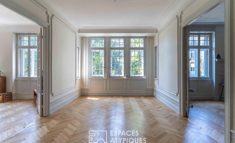 Situé dans un secteur prisé, à quelques minutes à pied de l'Orangerie et des Institutions Européennes, cet appartement bourgeois de 246 m² prend place au premier étage avec ascenseur d'un bâtiment de caractère datant de 1910. Il a bénéficié en 2023 d'une rénovation de grand soin venue sublimer ses nombreux atouts de charme. L'entrée s'ouvre sur un généreux hall distribuant les différentes pièces de l'appartement et notamment le double séjour qui donne le ton des lieux avec son parquet massif, ses moulures, ses boiseries et sa belle hauteur sous plafond. Entièrement indépendante, la cuisine vient se loger derrière de superbes portes vitrées dont les lignes contemporaines épurées se marient élégamment avec le charme authentique des lieux. La pièce s'ouvre sur une terrasse en cours de construction, atout rare pour ce type de bien.La partie nuit accueille une buanderie, une salle d'eau ainsi que cinq vastes chambres qui affichent également tout le charme de l'ancien réinventé au service d'un art de vie dans l'air du temps. Une suite parentale disposant de sa propre salle de bain avec douche et baignoire achève les prestations de l'espace nuit.Une attention particulière a été apportée au confort avec l'installation d'un système domotique. Deux caves ainsi que trois chambres de bonne complètent ce bien d'exception qui ravira les amateurs du charme de l'ancien. Ecoles à 10 min à pied Bus à 2 min à piedAccès autoroute à 5 minCLASSE Energie : D/ Classe Climat : DMontant moyen estimé des dépenses annuelles d'énergie pour un usage standard, établi à partir des prix de l'énergie de l'année 2021 : entre 3 080euros et 4 200eurosContact : Alain Alain Roy (Ei) Agent Commercial - Numéro Rsac : - Strasbourg.