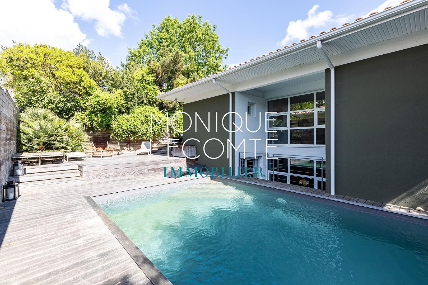 Bordeaux-Cauderan, l'agence Monique Lecomte Immobilier vous propose à la vente cette superbe maison contemporaine avec piscine, rénovée en 2021, d'environ 192 m2 habitables située à proximité immédiate du Golf Bordelais.Elle se compose d'une entrée donnant sur une magnifique pièce de vie baignée de lumière avec cheminée et cuisine semi ouverte entièrement équipée ouvrant sur une terrasse, d'une chambre avec salle d'eau et d'un bureau.En rez-de-jardin se trouvent une très belle suite parentale avec salle d'eau et dressing, deux chambres, une salle d'eau ainsi qu'une lingerie, le tout donnant sur un patio.Un garage et une cave complètent utilement cette villa pleine de charme à la décoration soignée.Un havre de paix dans un écrin de verdure.Rare.