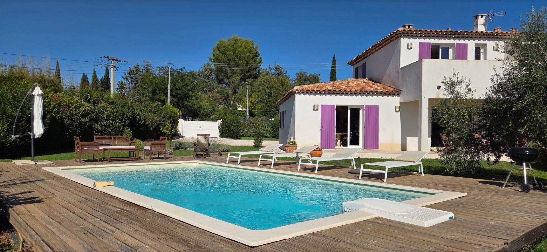L'agence Era du Comté d'Aix vous présente cette charmante maison située à Aix-en-Provence, quartier Saint-Mitre.Construit en 2011, ce bien aux belles prestations comporte deux niveaux.Au rez-de-chaussée une entrée avec rangements, une cuisine ouverte entièrement équipée, un séjour spacieux et lumineux orienté sud donnant accès à la terrasse couverte ainsi qu'au jardin, une chambre parentale avec sa salle d'eau et son bureau/dressing.A l'étage deux chambres supplémentaires dont une possède son propre balcon, une salle de bain, et un W.C séparé.Un garage pouvant être aménagé en chambre supplémentaire complète la maison.L'extérieur se compose sur l'avant du terrain d'un espace pouvant accueillir 3 voitures facilement, et de l'autre côté un jardin orienté Sud-Ouest, clos et arboré avec sa piscine de 8 mètres par 4.Quelques autres caractéristiques importantes :- Pompe à chaleur réversible- Arrosage automatique- Vide sanitaireL'accès aux nombreuses commodités (écoles, supermarché etc...) depuis la maison est très facile que ce soit en voiture ou en bus.A découvrir sans attendre !!! N'hésitez pas à me par téléphone pour plus de renseignements et organiser une visite. Clément Petitbon Rsac 932 338 379 - Téléphone : Honoraires à la charge de l'acquéreur (4,03%)inclus dans le prix de vente.