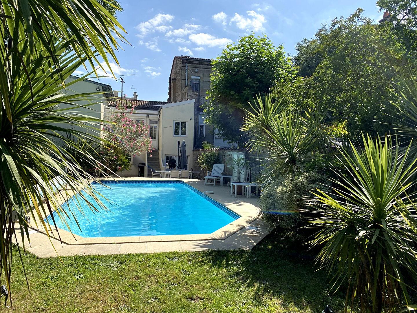 Bien d'exception tant par sa géolocalisation que par la qualité de ses prestations, cette double échoppe de 225 m2 sur deux niveaux, lumineuse, traversante et très bien entretenue vous séduira de par ces espaces divers et variés, intimes et conviviaux.Elle se compose au niveau principal d'une entrée avec carreaux de ciment desservant sur la gauche deux pièces, sur la droite, un double séjour traversant avec parquet d'origine en très bon état, une cuisine aménagée équipée surplombant le jardin, une véranda, une salle d'eau, un Wc indépendant, une suite parentale avec dressing. Au niveau secondaire, deux chambres, deux salles d'eau, un Wc, une grande salle de cinéma et billard, une salle de musique, une cave, une buanderie, et une cuisine d'été / bar avec accès direct sur l'extérieur côté piscine.Le jardin est extrêmement agréable, inimaginable en plein centre-ville de Bordeaux, paysagé avec goût, avec dépendance, piscine, salon d'été, et végétation d'exception.Toutes les commodités à pieds, proche du tram B.A découvrir !