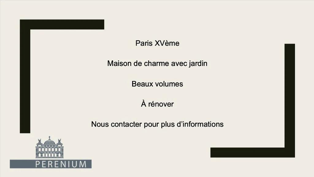 Maison De Caractère À Renover - Paris XVèmeNous vous proposons à la vente cette maison de caractère avec jardin privatif, à l'abri des regards, située dans une rue calme et verdoyante du XVème arrondissement de Paris.Cette maison est agencée sur 4 niveaux : un sous-sol, un rez-de-chaussée avec jardin, 3 étages pour une superficie totale de 250m² habitable.Celle-ci se compose de la manière suivante :- Au rez-de-chaussée : 2 chambres, un bureau, une salle de bain, toilettes et un dressing.- Au 1er étage : 3 chambres, une cuisine, une salle de bain, toilettes et un dressing.- Au 2ème étage : un double séjour avec une cuisine ouverte équipée, une salle de bains, toilette.- Au 8288 3ème et dernier étage : un dégagement donnant sur deux chambres.Un jardin de 55m2 et un sous-sol bétonné de 42m2 complètent ce bien.La maison a un agencement fonctionnel, sans perte d'espace, traversante, le plan est facilement modulable.Chauffage : chaudière au gazEau chaude : ballon électriqueLes informations sur les risques auxquels ce bien est exposé sont disponibles sur le site Géorisques :